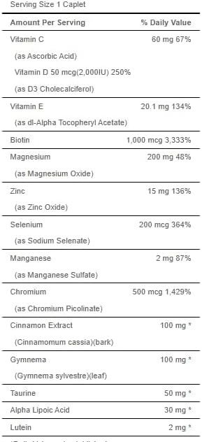 Vitamin C (As Ascorbic Acid), Vitamin D (As D3 Cholecalciferol), Vitamin E (As Dl-Alpha Tocopheryl Acetate), Biotin, Magnesium (As Magnesium Oxide), Zinc (As Zinc Oxide), Selenium (As Sodium Selenate), Manganese (As Manganese Sulfate), Chromium (As Chromium Picolinate), Cinnamon Extract (Cinnamomum Cassia) (Bark), Gymnema (Gymnema Sylvestre) (Leaf), Taurine, Alpha Lipoic Acid, Lutein.Puritans Pride offers high-quality vitamins and supplements for health and wellness.Take 1 Caplet Daily.Supplement Warning: Consult your healthcare professional before use if you have diabetes, are pregnant, nursing, or taking any medications. This product is not intended to treat, cure, or prevent any disease.