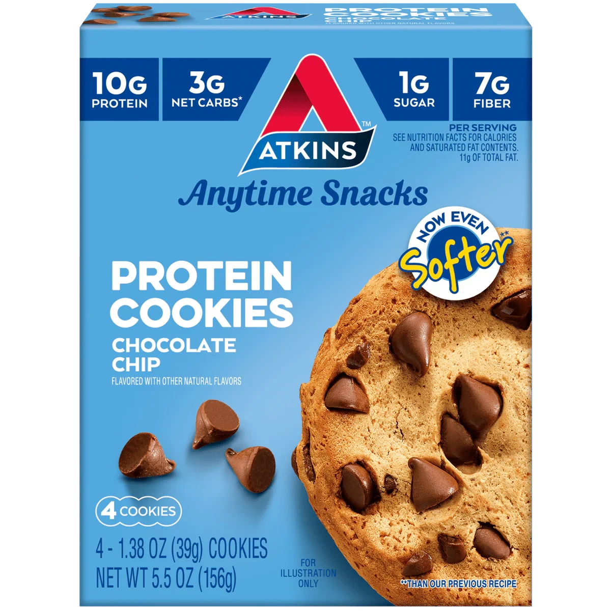 Atkins Snack Protein Cookies are a delicious, low-carb snack option with 10g of protein and 1g of sugar per serving. Perfect for those following a low-carb lifestyle, these cookies are soft and chewy, flavored with chocolate chip and other natural flavors. Key Features 10g Protein per serving 3g Net Carbs 1g Sugar 7g Fiber Chocolate Chip flavor Soft & Chewy texture Flavored with other natural flavors Key Ingredients: Protein blend, Vegetable glycerin, Chocolate Chips, Polydextrose, Water, Flour blend, Cocoa Powder, Natural flavors, Sweeteners (Maltitol/Sucralose).Atkins is known for its low-carb, high-protein snacks and meal solutions.Ready to eat. Consume as a low-sugar snack.See nutrition facts for calories and saturated fat contents.