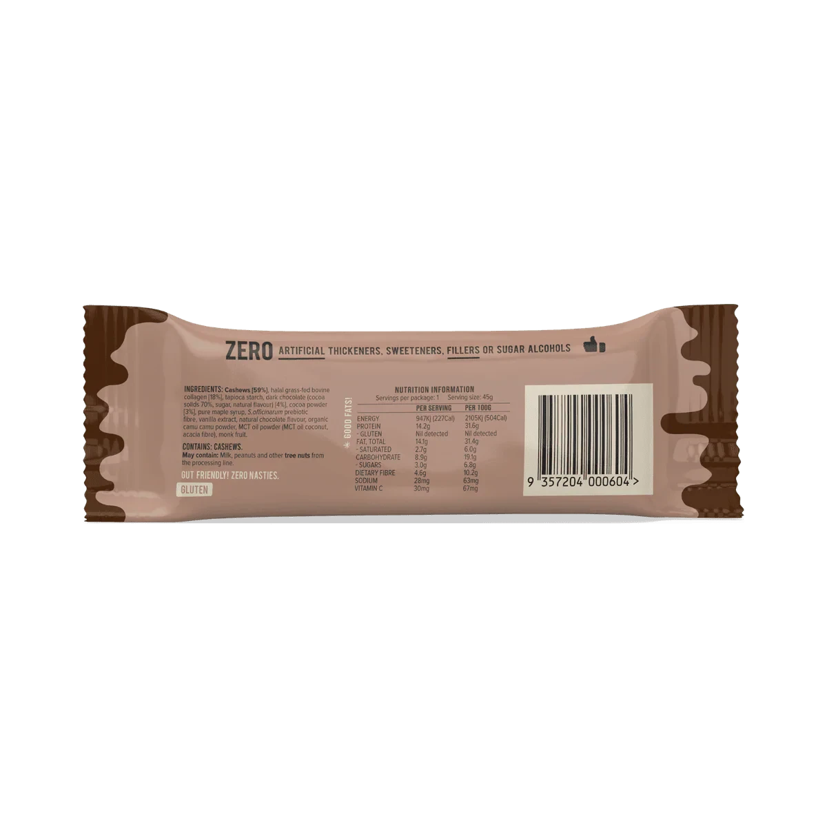 Chief Collagen Protein Bar Double Chocolate 45g is packed with protein, healthy fats, and fiber. It features a biscuity chocolatey cashew butter core and a luscious dark chocolate coating. Ideal for keto and paleo diets, it supports gut health and curbs cravings. Key Features Keto and Paleo friendly High in dairy-free protein No added sugar Gluten-free High in healthy fats Gut-friendly Preservative-free Egg-free Soy-free GMO-free Cashews [59%], Halal Grass Fed Bovine Collagen [18%], Tapioca Starch, Dark Chocolate (Cocoa Solids 70%, Sugar, Natural Flavour) [4%], Cocoa Powder [3%], Pure Maple Syrup, S.Officinarum Prebiotic Fibre, Vanilla Extract, Natural Chocolate Flavour, Organic Camu Camu Powder, Mct Oil Powder (Mct Oil Coconut, Acacia Fibre), Monk Fruit.Chief: Australian brand known for nutrient dense snacks without additives, using grass fed ingredients.Ready to eat. Consume pre or post workout or between meals as a protein source.Contains: Cashews. May Contain: Milk, Peanuts And Other Tree Nuts From The Processing Line.