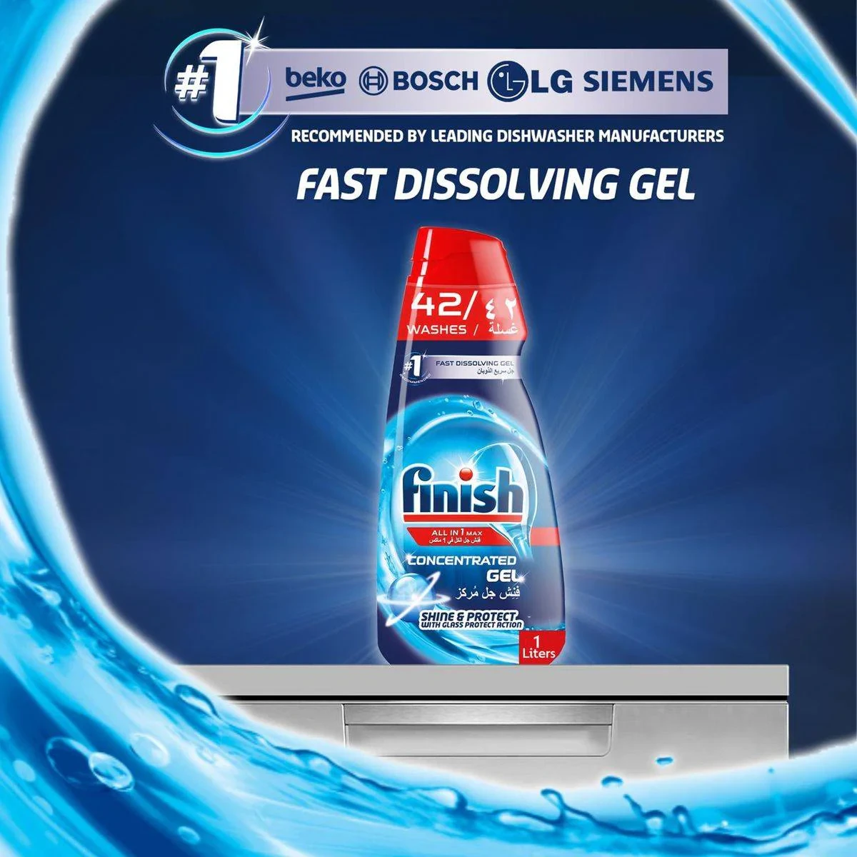 Finish Dishwasher Concentrated Power Gel Regular 1L is a fast-dissolving gel that delivers an amazing clean and shine, even in short cycles. It offers protection against glass corrosion, maintaining the sparkling shine of glassware. Recommended by leading dishwasher manufacturers like Bosch, Siemens, LG, and Beko. Key Features Fast dissolving gel for quick cleaning Effective even in short cycles Prevents glass corrosion Recommended by leading dishwasher manufacturers Provides ultimate clean and shine Enzymes (Protease, Amylase), <5% Polycarboxylates, Non-ionic Surfactants, Phosphonates, Perfumes, Preservatives.Finish is a global leader in automatic dishwasher products. This is a concentrated gel detergent.Fill the dispenser cup according to the machine manufacturer's directions (check pack for dosage guide). Close dispenser and run dishwasher.DANGER: Causes serious eye damage. Keep out of reach of children. If swallowed, call a Poison Center. If in eyes, rinse cautiously with water for several minutes.