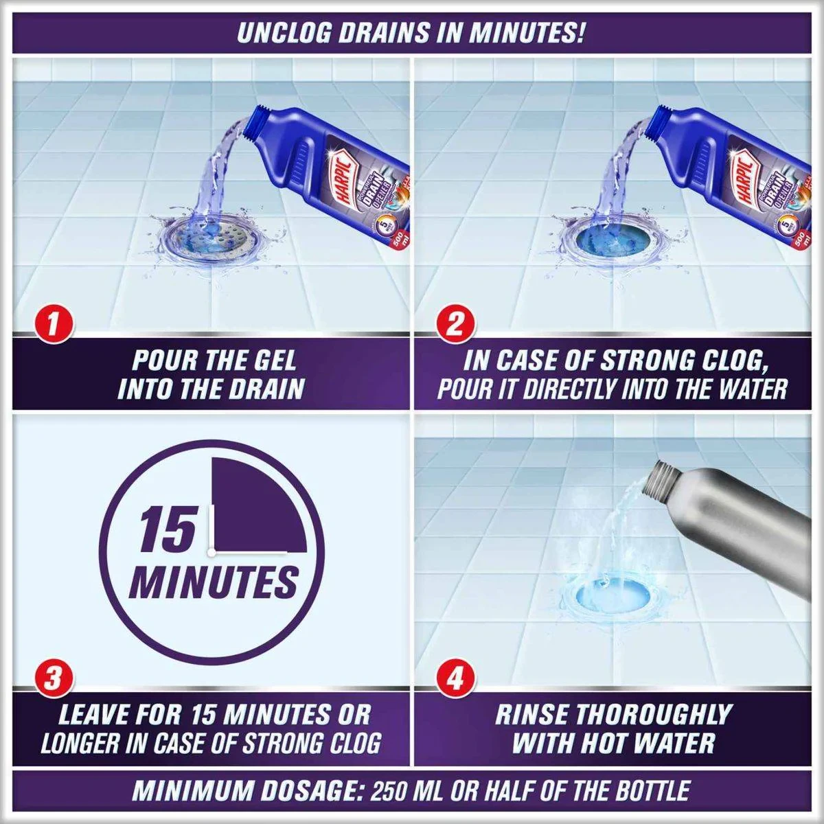 Harpic Powerful Drain Opener Cleaning Gel is designed to unclog drains quickly and efficiently. It works in just 5 minutes, killing 99.9% of germs, making it ideal for use in bathrooms and kitchens. Key Features Unclogs drains in minutes Kills 99.9% germs Effective for bathroom, shower, baths, basin, kitchen Powerful drain opener Sodium Hydroxide (Caustic Soda), Sodium Hypochlorite (Bleach), Non-ionic Surfactants, Water.Harpic is a global brand. This is a heavy-duty, corrosive cleaning gel designed to unblock clogged drains.Pour slowly the entire bottle (500ml) into the affected drain. Leave for 15-30 minutes. Flush thoroughly with hot water.DANGER: Highly corrosive. Causes severe skin burns and eye damage. Keep out of reach of children. Use protective gloves/eyewear.