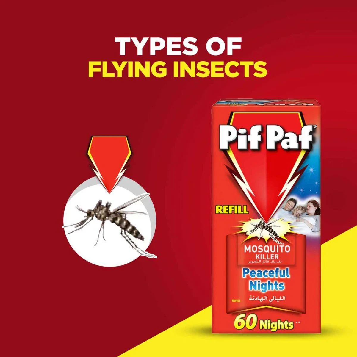 The Pif Paf Mosquito Killer Refill provides 100% protection from mosquitoes, ensuring peaceful nights. Designed for use with an electric device, it effectively kills mosquitoes and flies, acting as a first line of defense against diseases like Dengue and Malaria. The refill lasts up to 30 nights, offering a convenient and powerful solution for mosquito control. Key Features 100% protection from mosquitoes Effective all night long Kills illness-causing insects Dual-mode for high and low-intensity settings Low electricity consumption Active Ingredient: Prallethrin or Transfluthrin. Carrier: Deodorized hydrocarbon solvent. Mat/Vaporizer Pad Material.Pif Paf (owned by Reckitt Benckiser) is a global brand of insect control products. This is a liquid refill for an electric mosquito diffuser.Insert the liquid refill unit into the electric diffuser plug. Plug into a power outlet. Ensure device is upright.WARNING: Use only in a well-ventilated area. Harmful if swallowed. Highly toxic to fish/aquatic life.