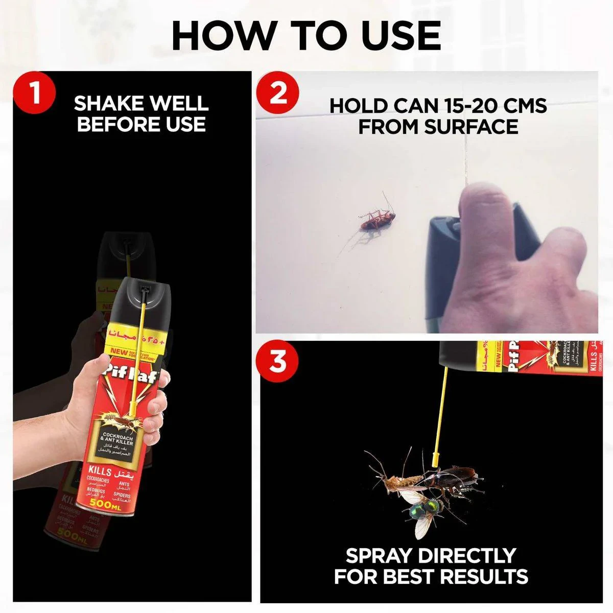 Pif Paf Insect Killer Spray is designed to eliminate cockroaches, ants, bedbugs, and spiders. Its powerful formula ensures quick action and long-lasting protection. Ideal for use in kitchens, around garbage bins, and under stoves. Key Features Kills cockroaches and ants instantly Effective against bedbugs and spiders Easy reach spray 500 ml size Active Ingredients: Imiprothrin, Cypermethrin. Inactive Ingredients: Hydrocarbon Solvent, Propellant.Pif Paf is a global brand of insecticide sprays. This formula is targeted at crawling insects.Spray directly onto insects or surfaces where they walk from a distance of 15-20 cm. Spray cracks and hiding places.DANGER: EXTREMELY FLAMMABLE. Pressurized container. Harmful by inhalation. Keep out of reach of children. Highly toxic to fish/aquatic life.