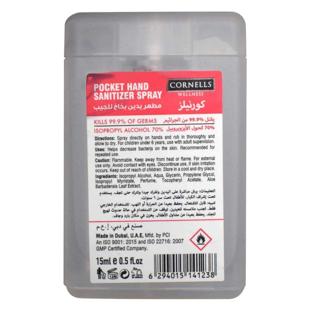 This pocket-sized hand sanitizer spray contains 70% isopropyl alcohol, effectively killing 99.9% of germs. Infused with vitamin E and moisturizers, it leaves hands feeling soft and nourished. Ideal for on-the-go use, it ensures hygiene and protection wherever you are. Key Features Kills 99.9% of germs Contains 70% isopropyl alcohol Leaves hands feeling soft Antiseptic and disinfectant Compact and portable Infused with vitamin E and moisturizers Isopropyl Alcohol, Aqua, Glycerin, Propylene Glycol, Isopropyl Myristate, Perfume, Tocopheryl Acetate, Aloe Barbadensis Leaf Extract.Cornells: Experts in wellness and hygiene solutions, known for effective hand sanitizers and personal care products.Spray directly on hands and rub in thoroughly and allow to dry. For children under 6 years, use with adult supervision.For Children Under 6 Years, Use With Adult Supervision.