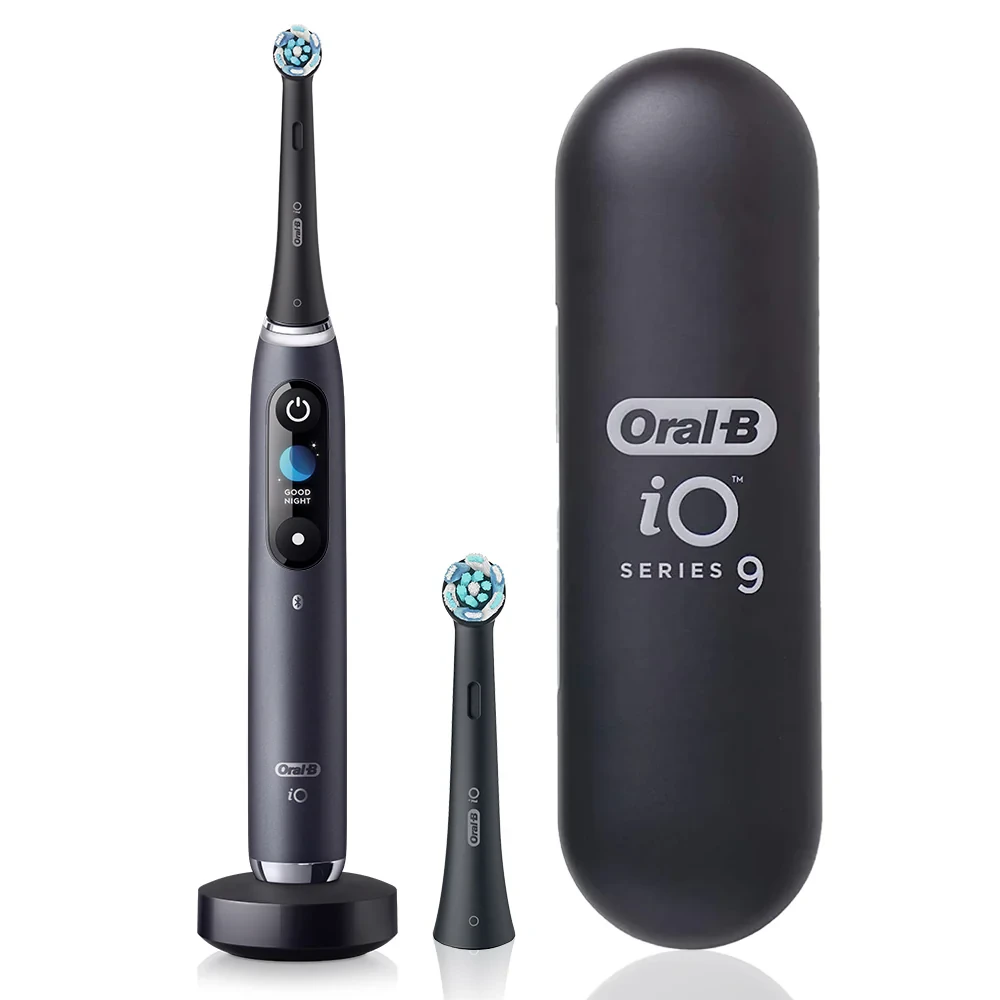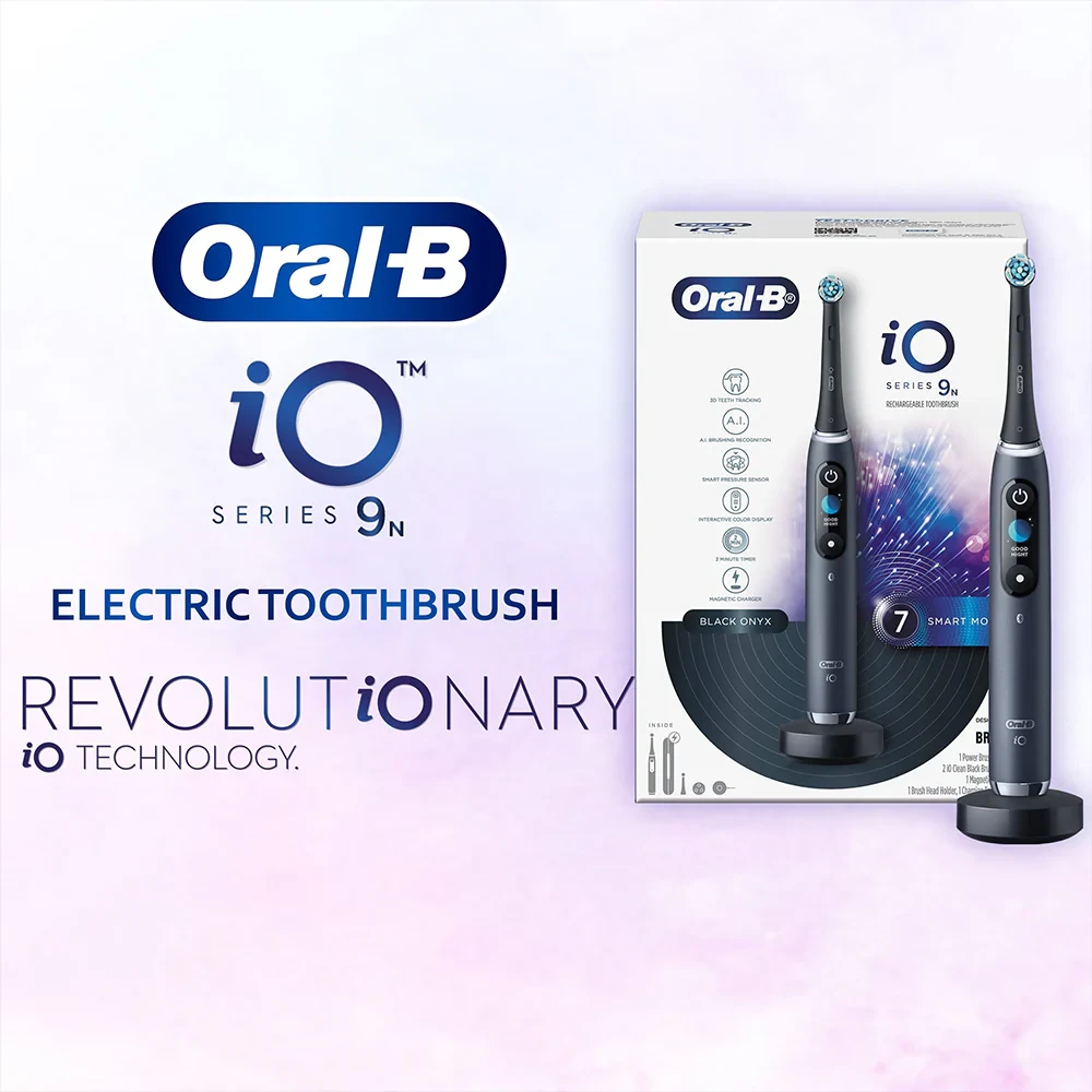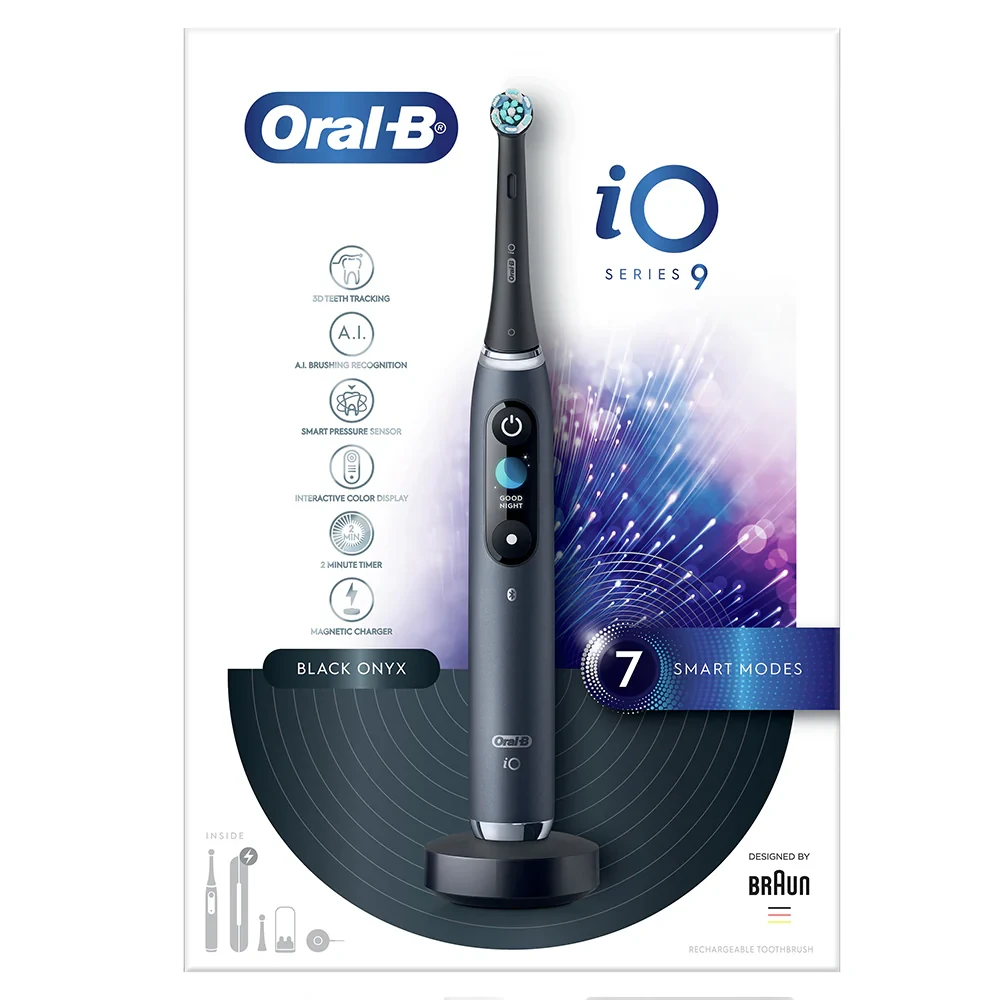Experience the ultimate in oral care with the Oral B iO9 Black Onyx Rechargeable Toothbrush. This sleek and powerful electric toothbrush features 7 smart modes to cater to your specific needs. Equipped with cutting-edge iO technology and AI with 3D Teeth Tracking, it ensures a personalized and effective brushing experience. The interactive display keeps you informed, while the fast magnetic charger ensures a quick 3-hour charging time. Elevate your dental hygiene routine with this advanced electric toothbrush. Oral B Electric Toothbrush Rechargeable iO9 Black OnyxREVOLUTIONARY MAGNETIC iO TECHNOLOGY – Delivers Oral-B’s best-ever clean with a professional, gentle brushing experience. ROUND BRUSH HEAD WITH MICRO-VIBRATIONS – Combines unique design with gentle vibrations for 100% healthier gums in one week. 3D TEETH TRACKING WITH A.I. – Monitors brushing on all tooth surfaces and guides you for the most thorough clean. INTERACTIVE COLOUR DISPLAY – Shows brushing modes, head replacement reminder, and motivational greetings. 7 SMART MODES – Includes Daily Clean, Sensitive, Gum Care, Intense Clean, Whitening, Tongue Cleaner, Super Sensitive. ENHANCED SMART PRESSURE SENSOR – Lights up red, white, or green to guide correct brushing pressure. 3-HOUR QUICK CHARGE & CHARGING TRAVEL CASE – Magnetic charger locks in place; convenient charging at home or on the go.