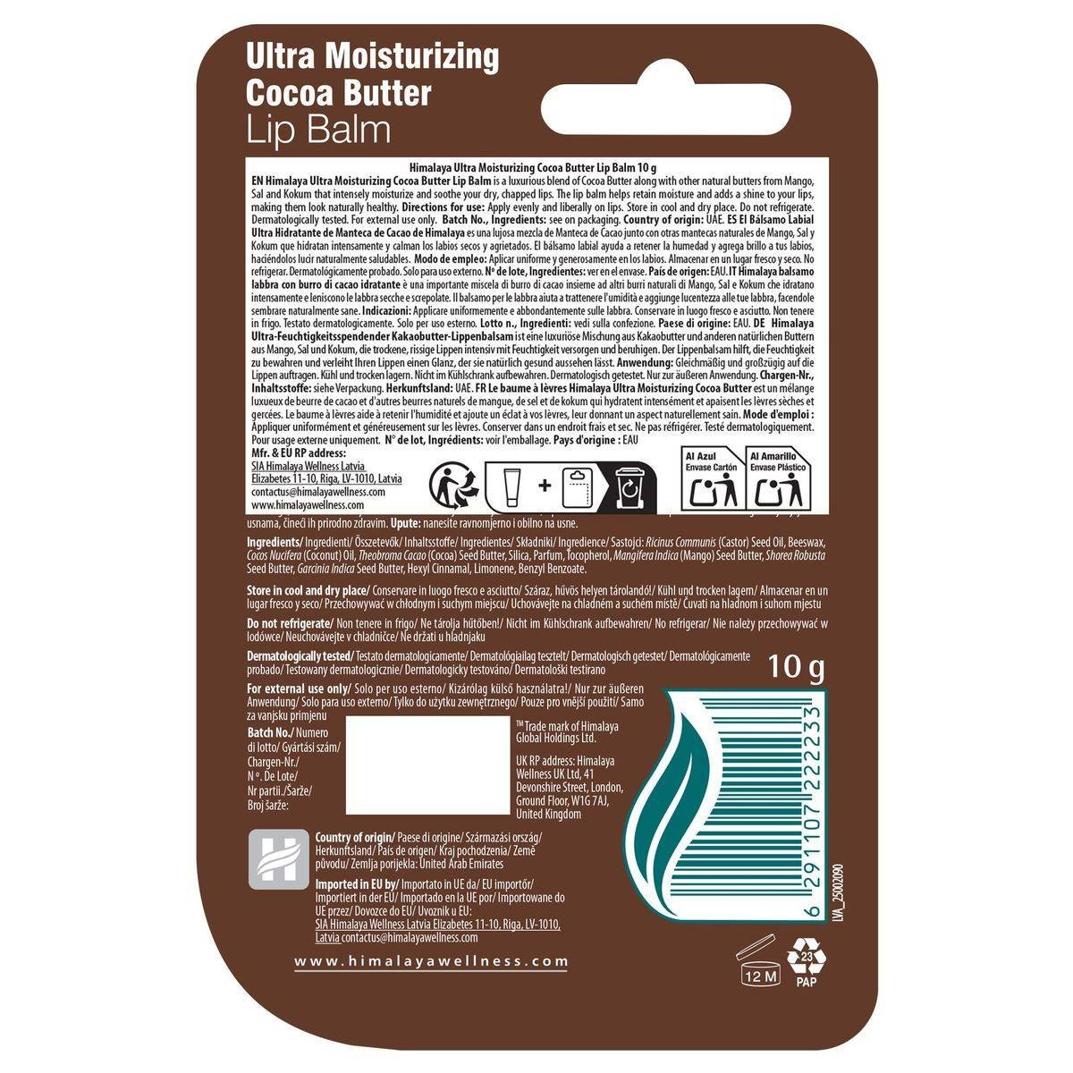 This ultra-moisturizing lip balm is enriched with cocoa butter to intensely hydrate and soothe dry, chapped lips. It provides long-lasting moisture and a natural shine, making lips look healthy and soft. Ideal for daily use, it is free from artificial colors and preservatives, ensuring safe and gentle care for your lips. Key Features Intensely moisturizes and soothes dry, chapped lips No artificial colors Enriched with natural butters Dermatologically tested Free from SLS/SLES, Parabens, Phthalates Cocoa Butter, Castor Seed Oil, Beeswax, Cocoa Seed Butter, Silica, Paraffin, Tocopherol, Mangifera Indica (Mango) Seed Butter, Shorea Robusta Seed Butter, Candelilla Wax, Limnanthes Alba (Meadowfoam) Seed Oil, Fragrance, Benzyl Benzoate.Himalaya: Trusted since 1930 for natural health and wellness products.Apply to clean lips as needed. Regular use is recommended for optimal results.For external use only.