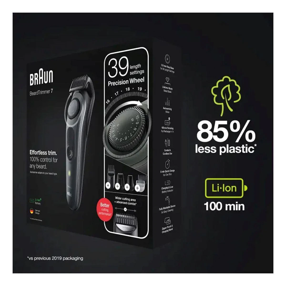 The Braun Beard Trimmer Series 7 offers precise grooming with a ProWheel for 40 length settings. Ideal for beard, body, and hair trimming with lifetime sharp blades and 100 minutes of cordless use. Key Features Lifetime sharp metal blades Precision wheel with 40 length settings 100 minutes of cordless run time 100% waterproof for wet or dry use AutoSense technology adapts to beard type Includes 12 tools in 1 kit LED charging and low battery indicator 5-minute quick charge for one trim Key Materials: Plastic body; AutoSense Metal Blade; Precision Dial (plastic); Rechargeable battery.Renowned for precision grooming tools and innovative technology.Use Wet Or Dry, Adjust Length With Prowheel.Electrical Warning: Keep charging unit away from water. Only use the charger supplied. Do not use if the cord or appliance is damaged.