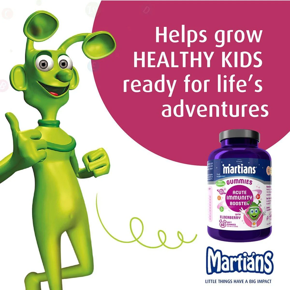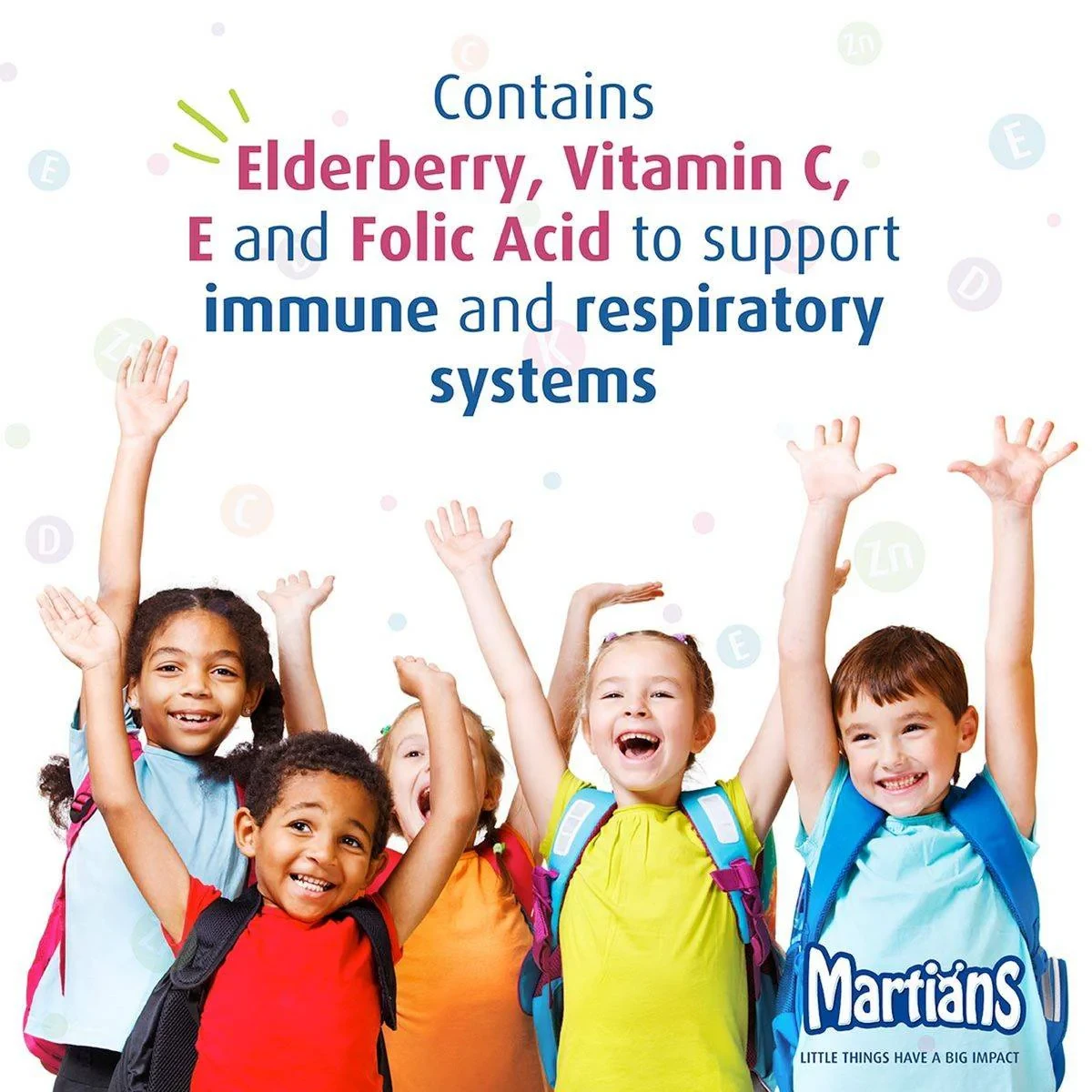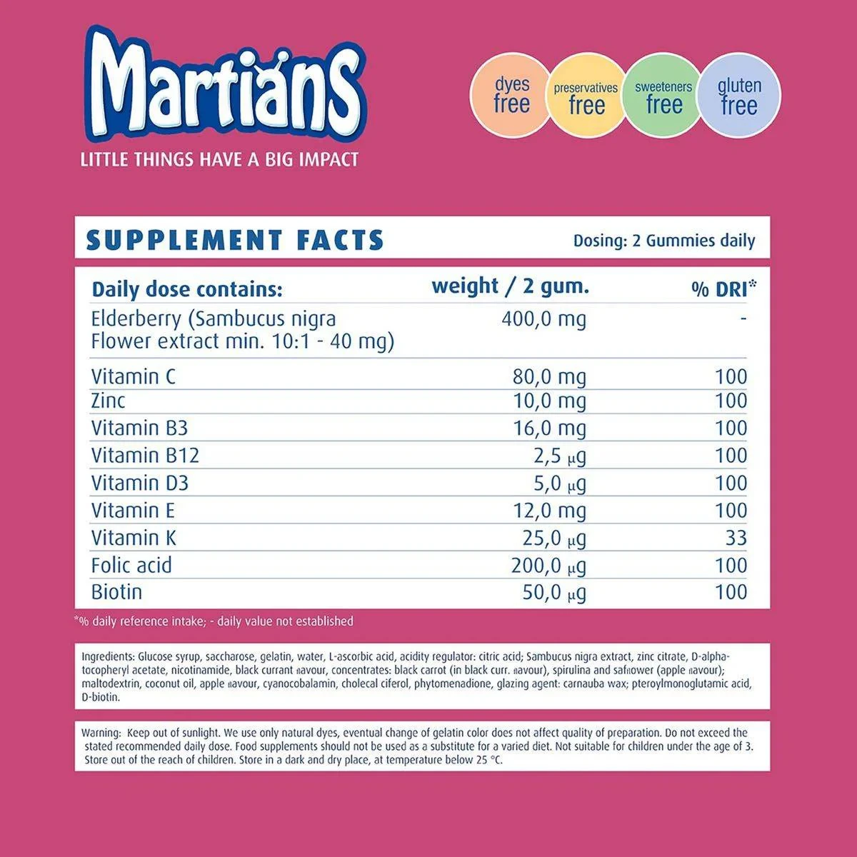 Glucose Syrup, Saccharose, Gelatin, Water, L Ascorbic Acid, Acidity Regulator: Citric Acid, Sambucus Nigra Extract, Zinc Citrate, D Alpha Tocopheryl Acetate, Nicotinamide, Blackcurrant Flavour, Concentrates: Black Carrot (In Blackcurrant Flavour), Spirulina And Safflower (Apple Flavour), Maltodextrin, Coconut Oil, Apple Flavour, Cyanocobalamin, Cholecalciferol, Phytomenadione, Glazing Agent: Carnauba Wax, Pteroylmonoglutamic Acid, D Biotin.Martians: Innovators in children's health supplements, known for their immunity boosting gummies.Take 2 gummies daily.Keep Out Of Sunlight. We Use Only Natural Dyes, Eventual Change Of Gelatin Color Does Not Affect Quality Of Preparation. Do Not Exceed The Stated Recommended Daily Dose. Food Supplements Should Not Be Used As A Substitute For A Varied Diet. Not Suitable For Children Under The Age Of 3. Store Out Of The Reach Of Children. Store In A Dark And Dry Place, At Temperature Below 25°C.