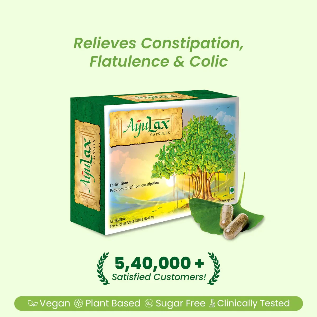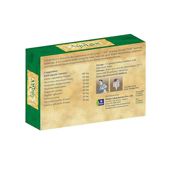 Ayulax Hard Gelatin Capsules are formulated with natural ingredients like Zingiber officinale and Pimpinella Anisum, known for their digestive benefits. This vegan, plant-based supplement is sugar-free and clinically tested to relieve constipation, flatulence, and colic, promoting healthy digestion and comfort. Key Features Ayurvedic herbal supplement Relieves constipation, flatulence, and colic Vegan and plant-based Sugar-free and clinically tested No side effects International quality standards Certified by The Sattvik Council of India ISO 9001:2008 certified Cassia Angustifolia Extract, Operculina Turpethum Extract, Terminalia Chebula Extract, Trachyspermum Ammi, Pimpinella Anisum, Zingiber Officinale, Helicteres Isora, Glycyrrhiza Glabra Extract, Emblica Officinale Extract.Ayulax: Pioneers in Ayurvedic herbal supplements, trusted globally for international quality standards.For Adults: Take 2 capsules two times daily, or as suggested by your healthcare provider. Do not exceed the daily recommended intake.Dietary Supplement: Consult a healthcare practitioner if pregnant/nursing, taking medication, or have a medical condition. Do not exceed recommended dose.