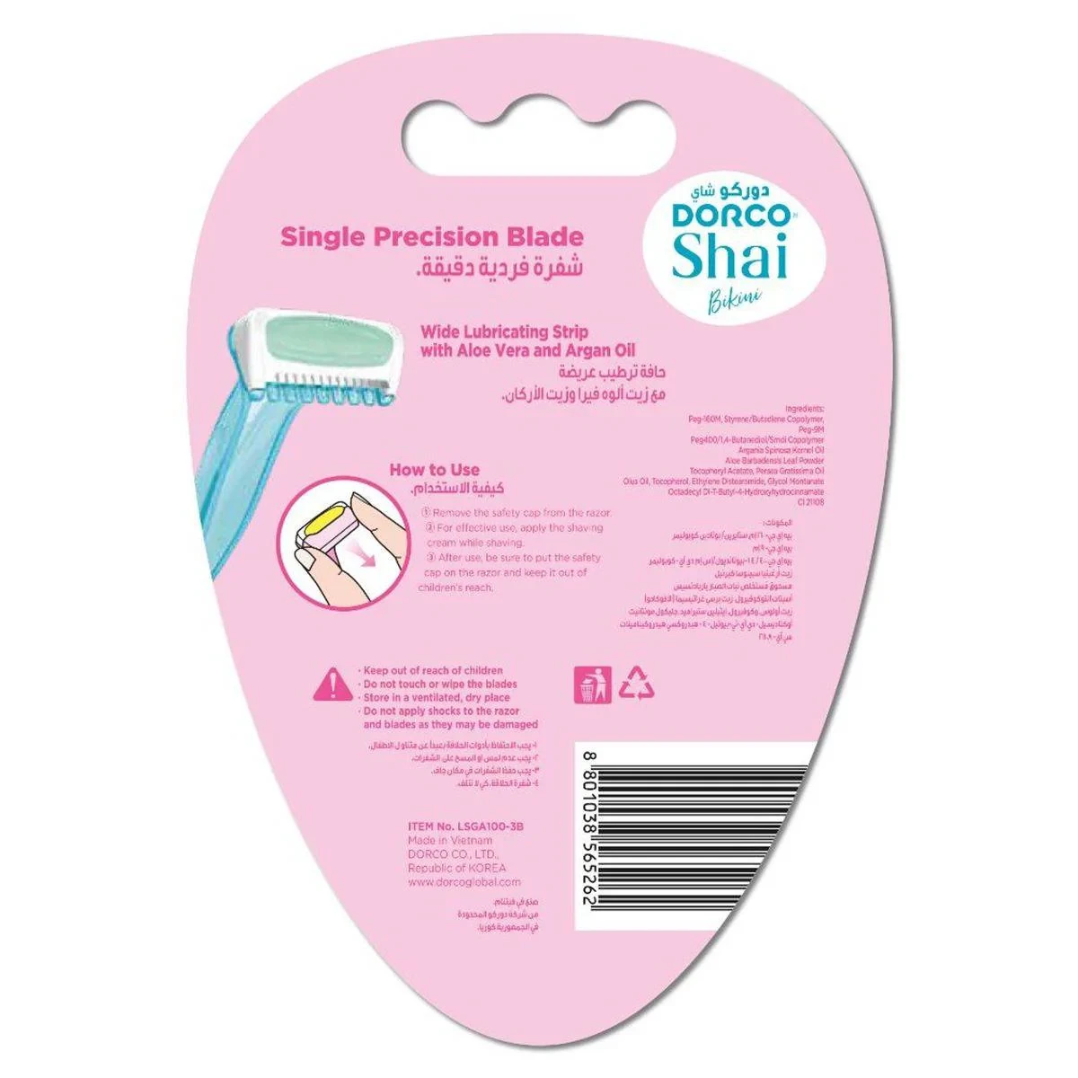 The Dorco Shai Bikini Razor is designed for gentle and precise grooming of the bikini area. Featuring a wide lubricating strip with Aloe Vera and Argan Oil, it ensures a smooth glide and minimizes irritation, making it ideal for sensitive skin. The ergonomic handle provides a comfortable grip for easy maneuvering in delicate areas. Wide lubrication strip with Aloe Vera and Argan Oil Single precision blade Suitable for sensitive skin Ergonomic handle for comfortable grip Compact head for precise bikini area grooming Peg-60M, Styrene Butadiene Copolymer, Peg-M Peg-400/14-Butanediol Smdi Copolymer, Argania Spinosa Kernel Oil, Aloe Barbadensis Leaf Powder, Tocopheryl Acetate, Persia Gratissima Oil, Olus Oil, Tocopherol, Ethylene Distearamide, Glycol Montanate, Octadecyl DI-T-Butyl-4-Hydroxyhydrocinnamate.Dorco: Innovators in shaving technology, offering precision razors for sensitive skin.Remove the safety cap from the razor. For effective use, apply the shaving cream while shaving. After use, be sure to put the safety cap on the razor and keep it out of children's reach.Remove the safety cap from the razor. For effective use, apply the shaving cream while shaving. After use, be sure to put the safety cap on the razor and keep it out of children's reach.