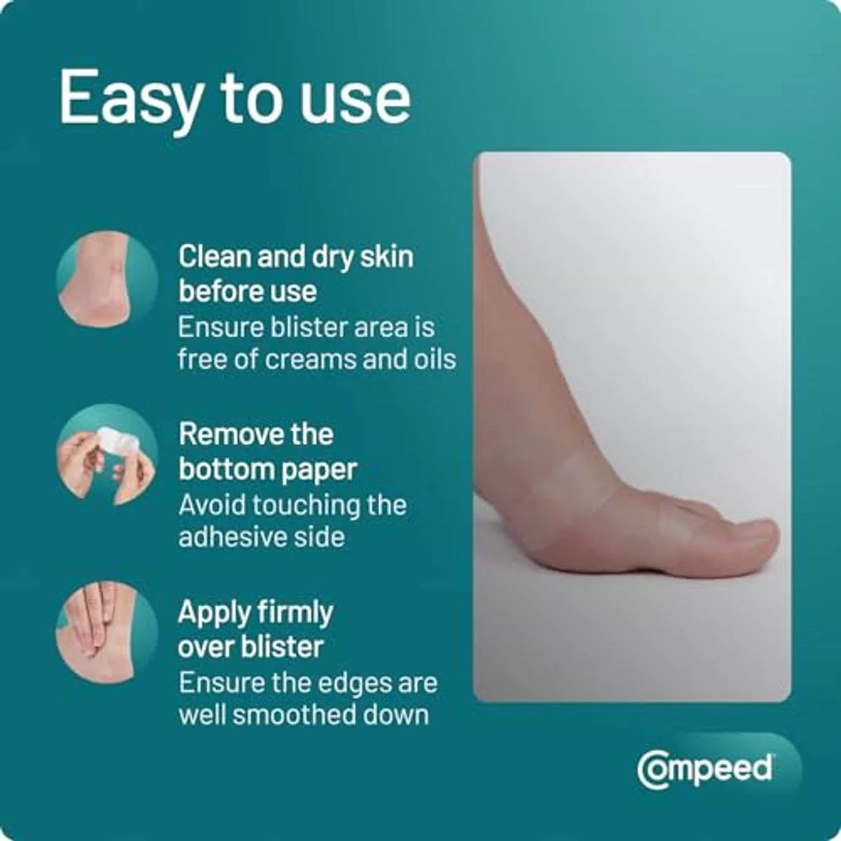 Compeed Blister Plasters for toes provide instant pain relief and fast healing with hydrocolloid technology. Designed to stay in place for days, they protect against rubbing and are waterproof and breathable. Features Instant pain relief Fast healing with hydrocolloid technology Waterproof and breathable Stays in place for several days Deep cushioning to relieve pressure Translucent edges to blend with skin Artificial Elastomer, Tackifier Resin, Hydrocolloid Particles.Compeed is the UK's number 1 brand for blister treatment, known for its advanced hydrocolloid technology.Clean wound, dry, apply plaster, ensure adhesionStatements Regarding Dietary Supplements Have Not Been Evaluated By The Fda And Are Not Intended To Diagnose, Treat, Cure, Or Prevent Any Disease Or Health Condition.