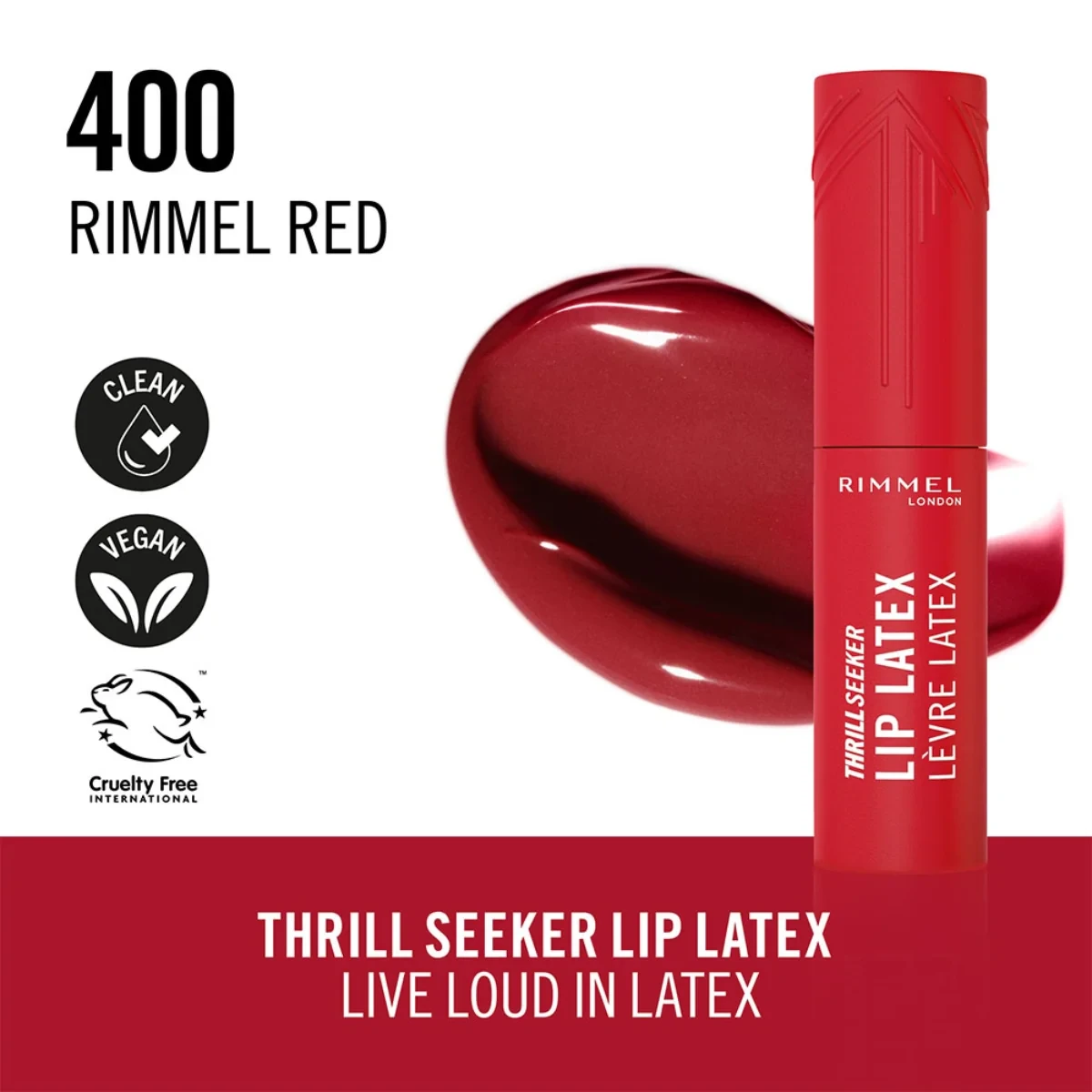 EXTREME 3D LATEX SHINE WITH UNSTOPPABLE COLOUR IN ONE SWIPE Get a bold unstoppable look in one swipe with Rimmel Thrill Seeker Lip Latex. The liquid lipstick drenches lips in extreme, vivid colour with a lasting lip stain, delivering instant shine, a hit of hydration, comfort that lasts all day and an ultra-smooth finish. The hyaluronic lipstick with a lightweight, lip-loving vegan formula infused with aloe vera, hyaluronic acid and vitamin E provides a smooth shine and leaves lips hydrated In just one swipe the colour glides on evenly The diamond-like shape applicator on the Rimmel lipstick ensures a sharp line and full application for a bold unstoppable look The easy-grip bottle with a soft-touch finish makes it easy to grip and less likely to slide out of your hands Does not contain latex Key Ingredients: Isododecane, Dimethicone, Trimethylsiloxysilicate, Polyethylene, Propylene Carbonate, Tocopheryl Acetate, Flavor, Colorants.Rimmel Thrill Seeker is a line of lip products. This is a liquid lip color designed for a high-shine, long-lasting look.Apply directly to lips using the applicator.For external use only. Discontinue use if irritation occurs.