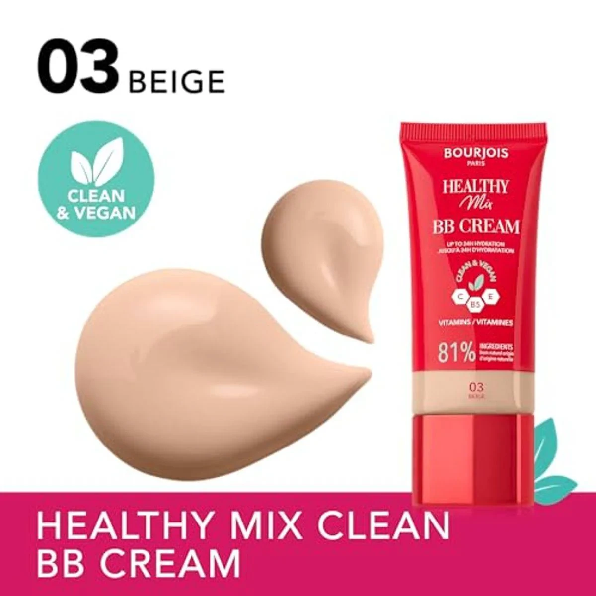 Bourjois Healthy Mix Clean BB Cream 03 Beige 30ml combines the coverage of a foundation with the hydration of a cream. Enriched with Vitamins C, E, and B5 for a radiant complexion. This clean and vegan formula evens skin tone, blurs pores, and conceals signs of fatigue. Ideal for all skin types, it is paraben-free, sulfate-free, and fragrance-free. Key Features