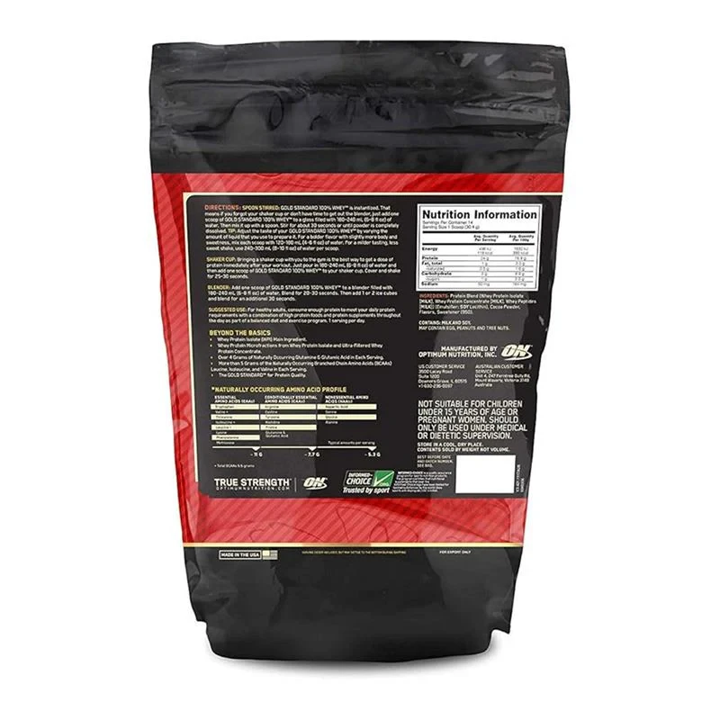 Whey Protein Isolates (WPI) are the purest form of whey protein that currently exists. WPIs are costly to use, but rate among the best proteins that money can buy. That's why they're the first ingredient you read on the Gold Standard 100% Whey™ label. By using WPI as the primary ingredient along with premium ultra-filtered whey protein concentrate (WPC), we're able to pack 24 grams of protein into every serving to support your muscle building needs after training. ON's attention to detail also extends to mixability. This superior quality powder has been instantized to mix easily using a shaker cup or just a glass and spoon. There's no doubt that this is the standard by which all other whey proteins are measured. Use this product as a food supplement only. Do not use for weight reduction. Intended for healthy adults over the age of 18.This product is labelled to United States standards and may differ from similar products sold elsewhere in its ingredients, labeling and allergen warningsWhey Protein Isolates (WPI) are the purest form of whey protein that currently exists. WPIs are costly to use, but rate among the best proteins that money can buy. That's why they're the first ingredient you read on the Gold Standard 100% Whey™ label. By using WPI as the primary ingredient along with premium ultra-filtered whey protein concentrate (WPC), we're able to pack 24 grams of protein into every serving to support your muscle building needs after training. ON's attention to detail also extends to mixability. This superior quality powder has been instantized to mix easily using a shaker cup or just a glass and spoon. There's no doubt that this is the standard by which all other whey proteins are measured.Consume approximately 1 gram of protein per pound of body weight through a combination of high protein foods and protein supplements. For the best results, consume your daily protein allotment over several small meals spread evenly throughout the day.
