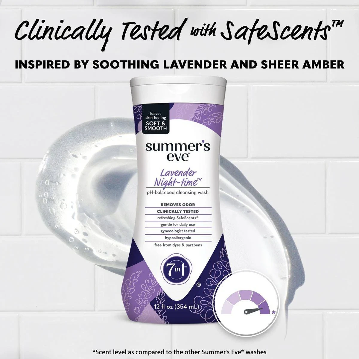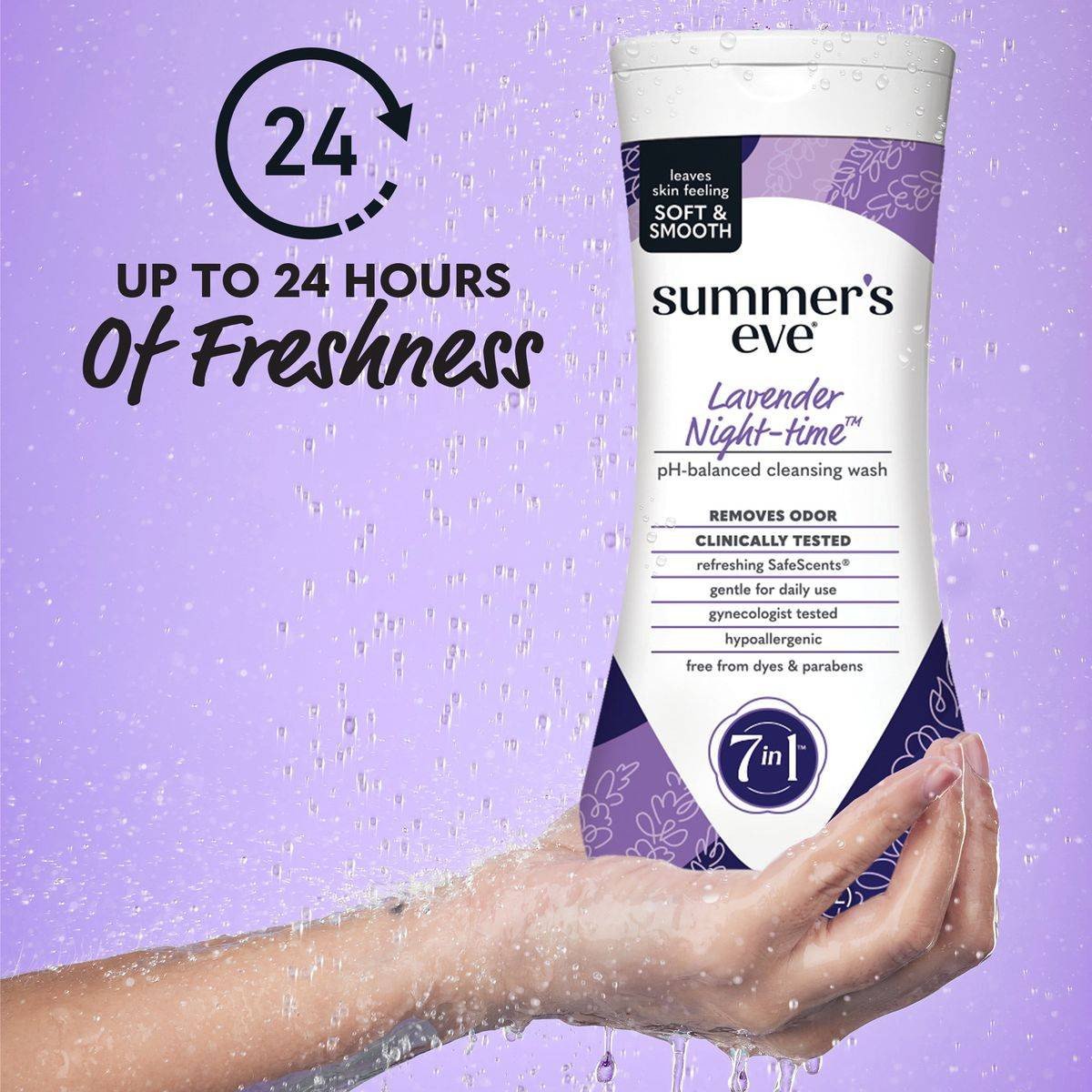Summer's Eve Lavender Night-time Daily Refreshing Wash is a pH-balanced feminine wash designed to remove odor and ensure a refreshing, cleansing experience. Formulated with soothing lavender and sheer amber, it is gentle enough for delicate skin and gynecologist tested for safety. pH-balanced feminine wash Removes odor Gynecologist tested Free from dyes & parabens Contains soothing lavender and sheer amber Gentle for daily use Hypoallergenic SafeScents technology Water, Sodium Laureth Sulfate, Cocamidopropyl Betaine, Sodium Chloride, Lauryl Glucoside, Polyquaternium-7, Chamomilla Recutita (Matricaria) Flower Extract, Lavandula Angustifolia (Lavender) Flower/Leaf/Stem Extract, Glycol Distearate, Laureth-4, Tocopheryl Acetate, Lactic Acid, Hydroxypropyl Methylcellulose, Glycerin, Sodium Benzoate, Disodium Edta, Sodium Lactate, Fragrance.Summer's Eve Lavender Night-time Daily Refreshing Wash is a pH-balanced feminine wash designed to remove odor and ensure a refreshing, cleansing experience. Formulated with soothing lavender and sheer amber, it is gentle enough for delicate skin and gynecologist tested for safety.Pour A Small Amount Onto Hand Or Washcloth, Apply To Wet Skin, And Rinse Thoroughly.For External Use Only. Contains An Alpha Hydroxy Acid (Aha) Which May Increase Sensitivity To The Sun. Use Sunscreen, Wear Protective Clothing, And Limit Sun Exposure While Using This Product And For A Week Afterward.