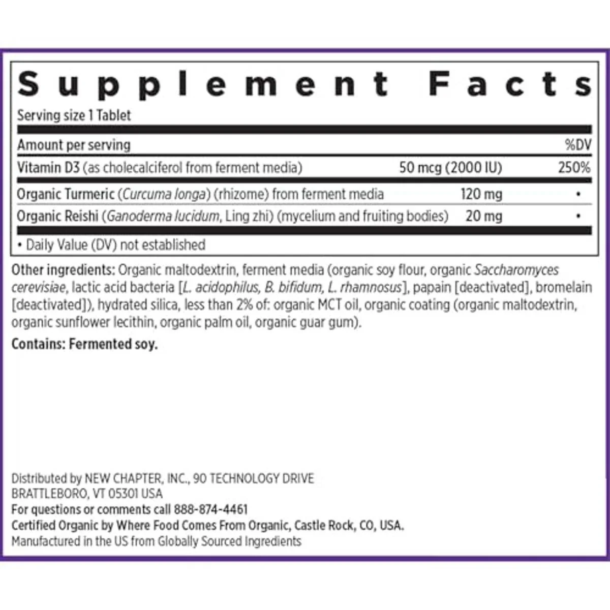 Vitamin D3 (as cholecalciferol from ferment media), Organic Turmeric (Curcuma longa) (rhizome) from ferment media, Organic Reishi (Ganoderma lucidum, Lingzhi) (mycelium and fruiting bodies), Organic maltodextrin, Ferment media (organic soy flour, organic Saccharomyces cerevisiae, lactic acid bacteria [L. acidophilus, B. bifidum, L. rhamnosus], papain [deactivated], bromelain [deactivated]), Hydrated silica, Less than 2% of: organic MCT oil, Organic coating (organic maltodextrin, organic sunflower lecithin, organic palm oil, organic guar gum).New Chapter specializes in fermented vitamins and supplements, emphasizing organic and sustainable practices.Take one tablet daily. Can be taken anytime, even on an empty stomach.Consult your healthcare professional if you have a medical condition or are taking medication. Nursing, pregnant, or considering pregnancy should consult healthcare professional prior to use.