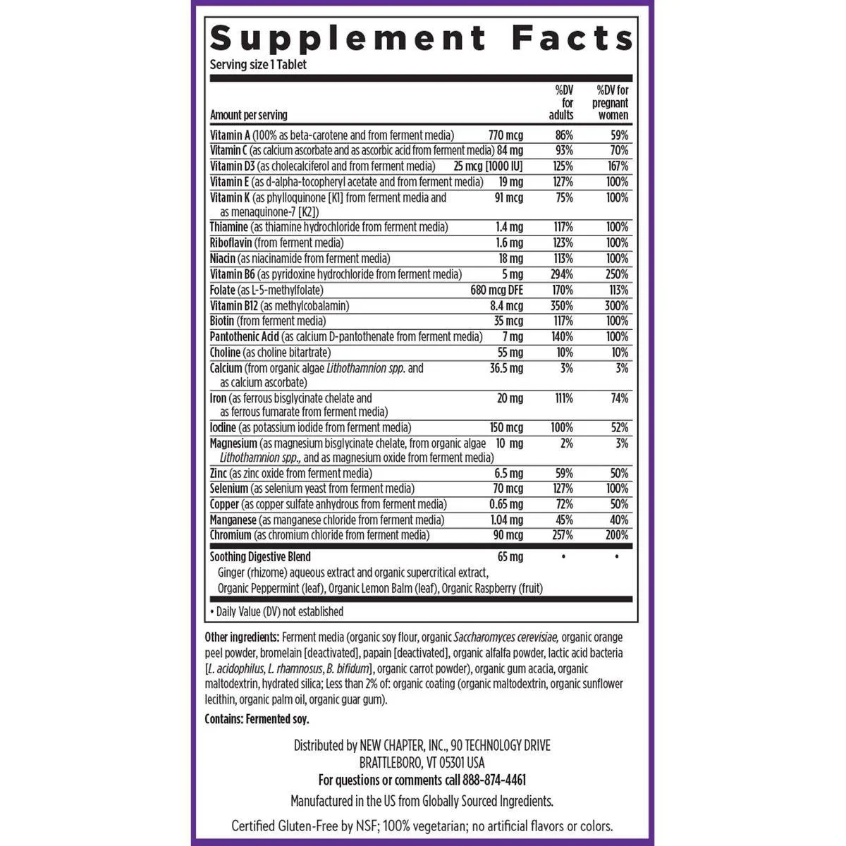 Vitamin A (100% as beta-carotene and from ferment media), Vitamin C (as calcium ascorbate and as ascorbic acid from ferment media), Vitamin D3 (as cholecalciferol and from ferment media), Vitamin E (as d-alpha-tocopheryl acetate and from ferment media), Vitamin K (as phylloquinone [K1] from ferment media and as menaquinone-7 [K2]), Thiamine (as thiamine hydrochloride from ferment media), Riboflavin (from ferment media), Niacin (as niacinamide from ferment media), Vitamin B6 (as pyridoxine hydrochloride from ferment media), Folate (as L-5-methylfolate), Vitamin B12 (as methylcobalamin), Biotin (from ferment media), Pantothenic Acid (as calcium D-pantothenate from ferment media), Choline (as choline bitartrate), Calcium (from organic algae Lithothamnion spp. and as calcium ascorbate), Iron (as ferrous bisglycinate chelate and as ferrous fumarate from ferment media), Iodine (as potassium iodide from ferment media), Magnesium (as magnesium bisglycinate chelate, from organic algae Lithothamnion spp., and as magnesium oxide from ferment media), Zinc (as zinc oxide from ferment media), Selenium (as selenium yeast from ferment media), Copper (as copper sulfate anhydrous from ferment media), Manganese (as manganese chloride from ferment media), Chromium (as chromium chloride from ferment media), Soothing Digestive Blend (Ginger rhizome aqueous extract and organic supercritical extract, Organic Peppermint leaf, Organic Lemon Balm leaf, Organic Raspberry fruit), Other ingredients: Ferment media (organic soy flour, organic Saccharomyces cerevisiae, organic orange peel powder, bromelain [deactivated], papain [deactivated], organic alfalfa powder, lactic acid bacteria [L. acidophilus, L. rhamnosus, B. bifidum], organic carrot powder), organic gum acacia, organic maltodextrin, hydrated silica; Less than 2% of: organic coating (organic maltodextrin, organic sunflower lecithin, organic palm oil, organic guar gum). Contains: Fermented soy.New Chapter specializes in high-quality, fermented multivitamins and supplements for prenatal health.Take one tablet daily, can be taken anytime, even on an empty stomach.As with any dietary supplement, you should advise your healthcare professional of the use of this product if you have a medical condition or are taking medication. If you are nursing, pregnant, or considering pregnancy, consult your healthcare professional prior to using this product. Discontinue use and contact your healthcare professional if you experience a side effect or an allergic reaction. Keep out of reach of children. WARNING: Accidental overdose of iron-containing products is a leading cause of fatal poisoning in children under 6. Keep this product out of reach of children. In case of accidental overdose, call a doctor or poison control center immediately.