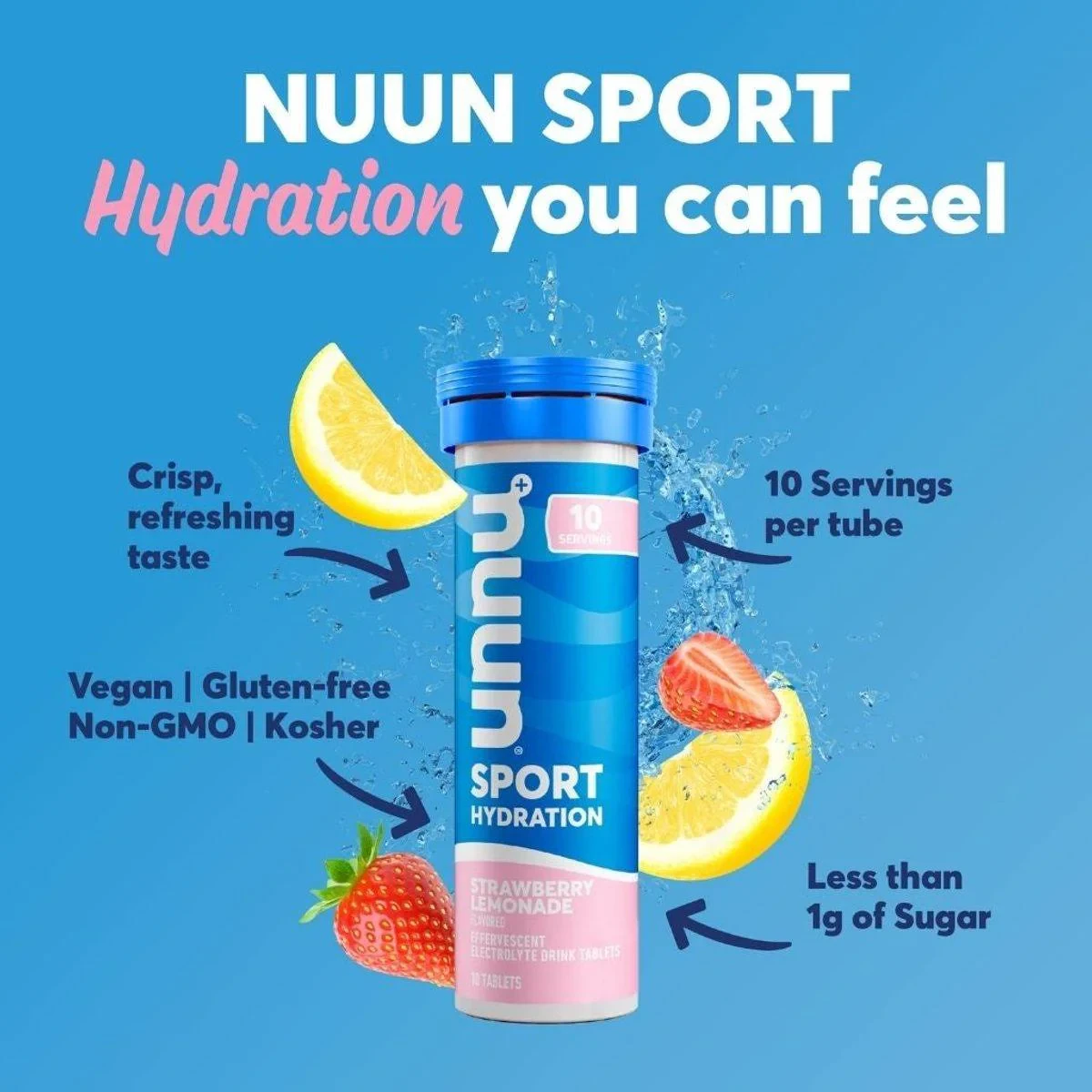 Nuun Sport Hydration Tablets provide essential electrolytes for hydration and muscle function. Designed for active lifestyles, they are vegan, gluten-free, and non-GMO. Each tablet dissolves in water to create a refreshing drink that replenishes electrolytes lost during exercise. b Key Features Hydrating electrolyte tablets Vegan and gluten-free Non-GMO ingredients Contains 10 tablets per tube Strawberry Lemonade flavor Supports muscle function Less than 1g of sugar per serving Easy to dissolve in water Sodium (bicarbonate and carbonate), Potassium (bicarbonate and chloride), Magnesium (oxide), Calcium (carbonate), Citric acid, Dextrose, Natural flavors, Stevia leaf extract, Rice extract blend, Avocado oil, Beet juice powder, Riboflavin, Spirulina, Malic acid.Nuun: Innovators in hydration solutions, offering clean, plant-based electrolyte tablets for active lifestyles.Add one tablet to 16 fl oz water, wait to dissolve, and then drink to stay hydrated.Consult your healthcare practitioner if symptoms persist.