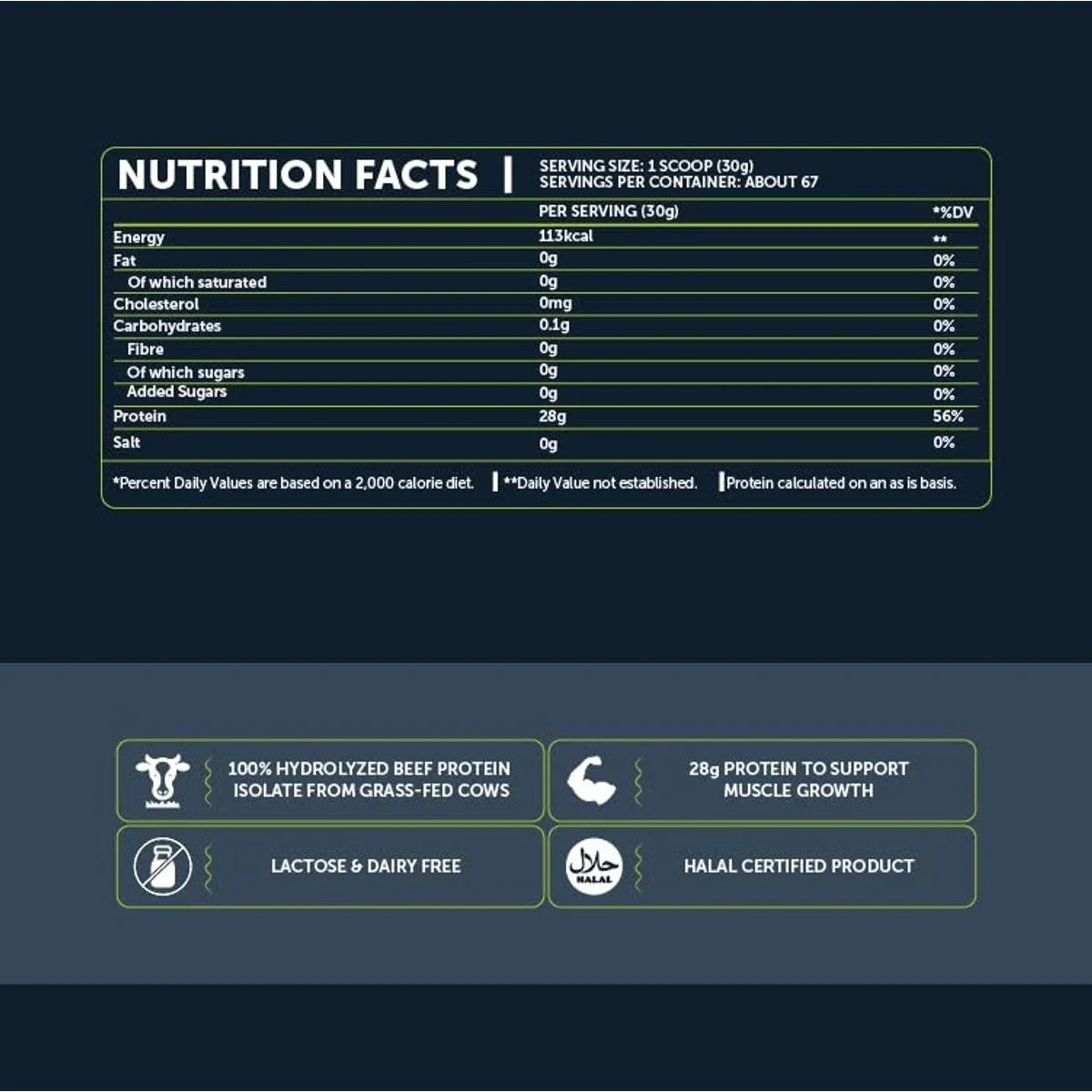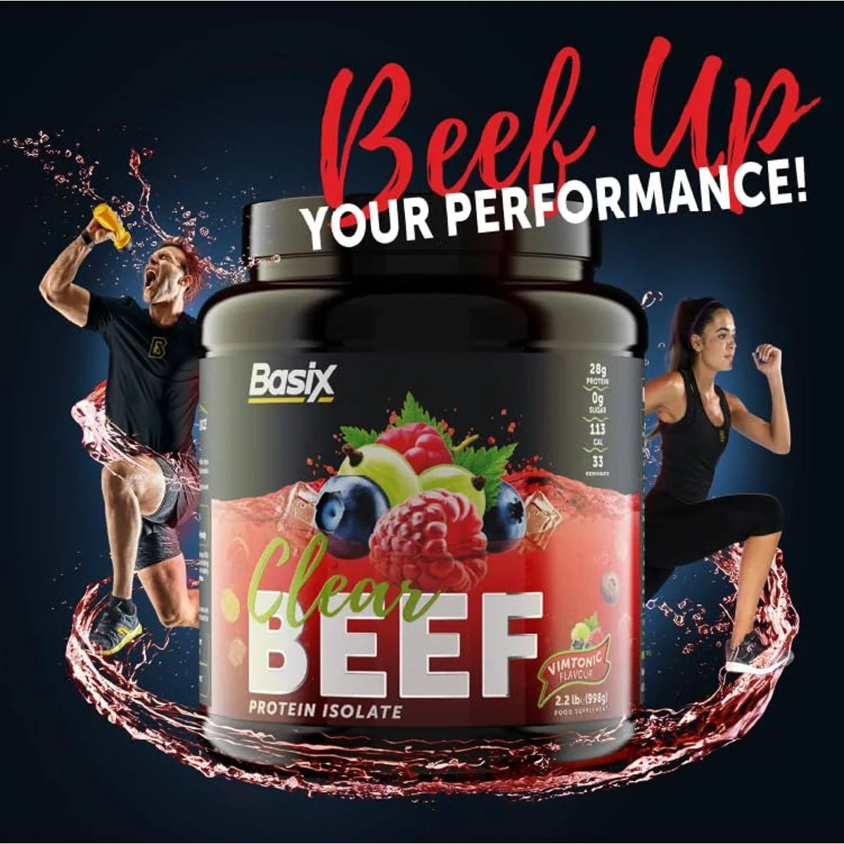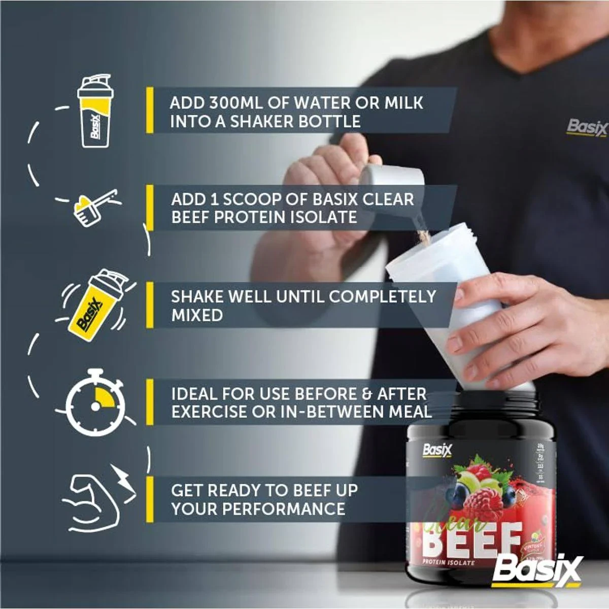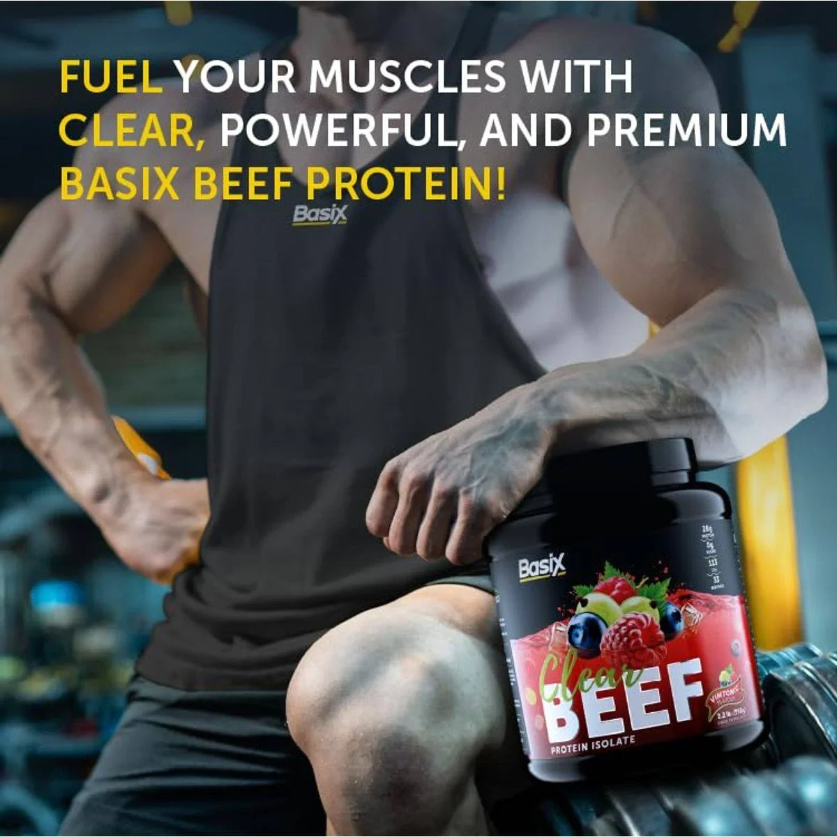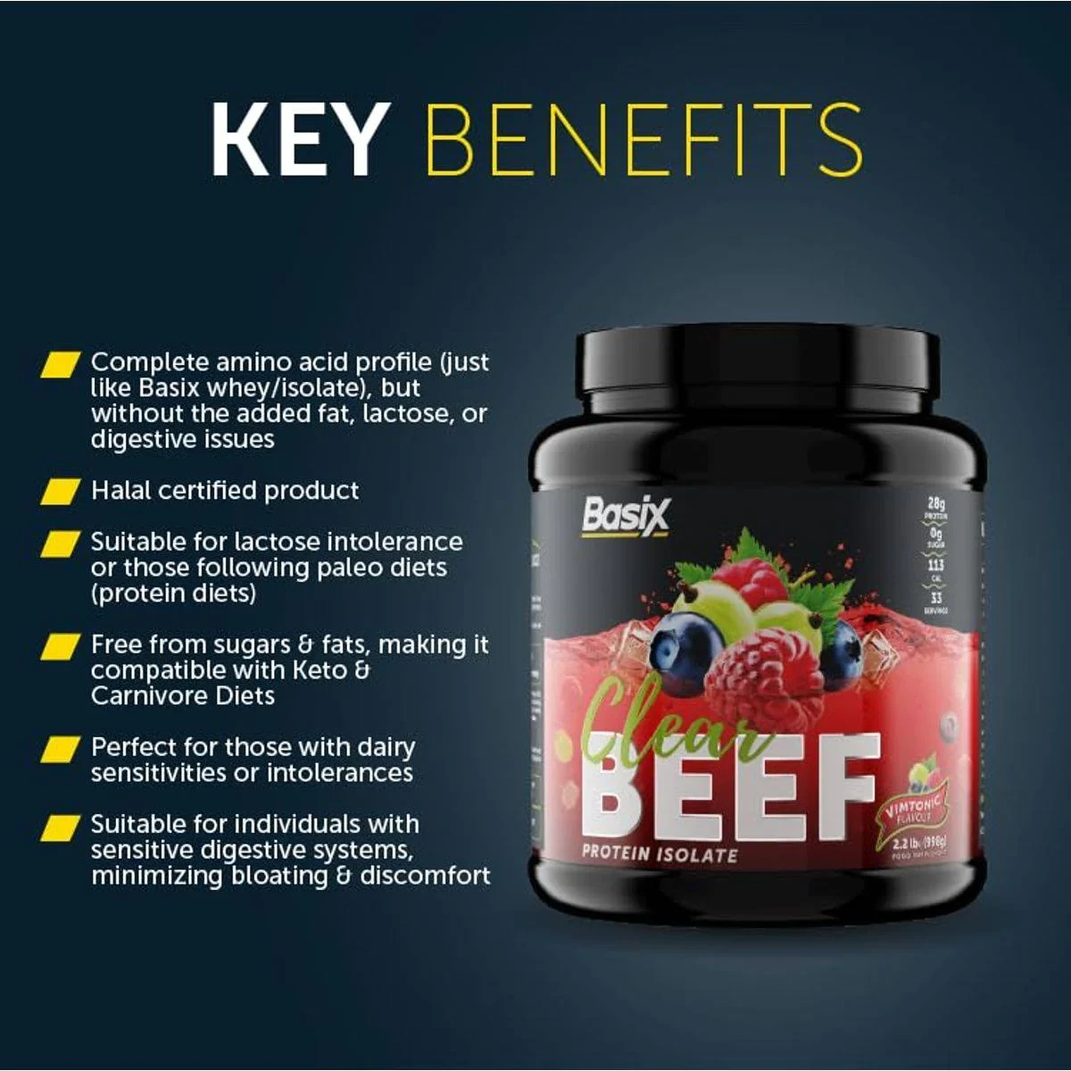 Basix Clear Beef Protein Isolate is a high-quality, low-calorie protein supplement ideal for muscle building and recovery. It offers a complete amino acid profile and is lactose-free, sugar-free, and fat-free. Features Complete amino acid profile Halal certified product Suitable for lactose intolerance Free from sugars & fats Compatible with Keto & Carnivore Diets Gentle on the stomach Hydrolyzed for easy absorption Fat-free and sugar-free Grass-fed cows, hormone-free and antibiotic-free Hydrolyzed Beef Isolate, Natural Flavoring, Citric Acid, Color (Caramel E150a), Sucralose, Stevia.Basix: Premium nutrition products for muscle building and recovery.Mix 1 scoop with 300ml of water or milk, shake well, and consume immediately.Check with a qualified health professional before using if under the age of 18, pregnant or nursing, or if you have any medical condition(s) or are taking medication(s). Store in a cool dry place, away from children. Do not exceed suggested use.