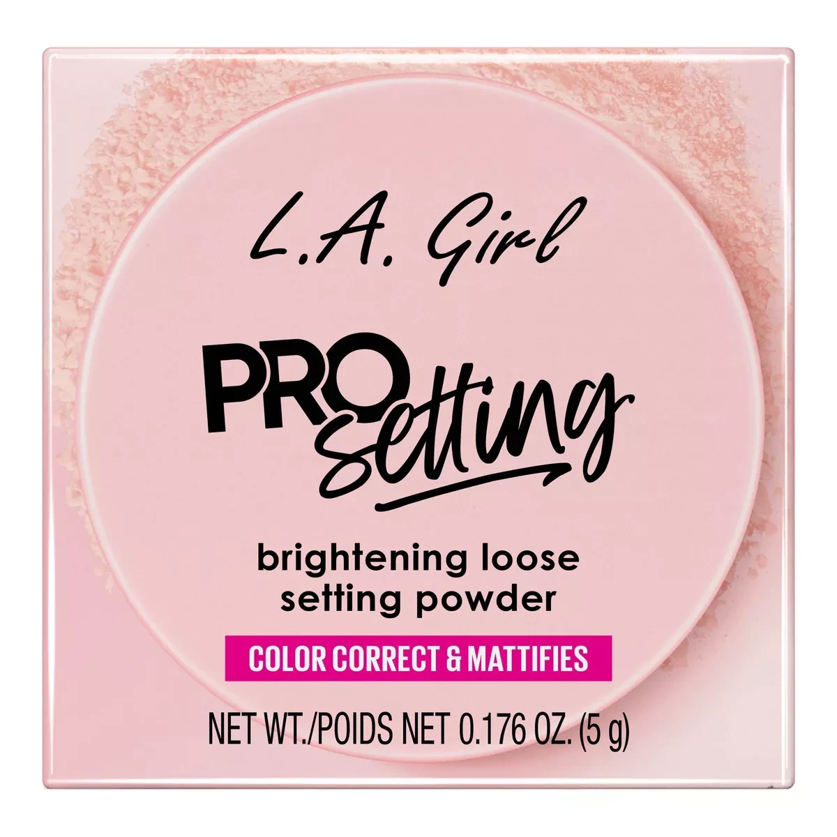 LA Girl Pro Setting Brightening Loose Setting Powder in Soft Pink is designed to set makeup and brighten the complexion. Ideal for creating a flawless, matte finish, it helps control shine and enhances your natural beauty. Key Features Brightening loose setting powder Color corrects and mattifies Soft pink shade Net weight 5g Key Ingredients: Talc or Silica, Mica, Aluminum Starch Octenylsuccinate, Pigments (Iron Oxides, Titanium Dioxide), Pink/Peach Tones for brightening.LA Girl offers innovative and affordable beauty products, specializing in vibrant makeup solutions.Apply a small amount to a puff or brush. Dust powder across the face to set makeup, absorb oil, or bake under the eye area, then buff off excess.For external use only. Discontinue use if irritation occurs. Avoid inhalation of powder dust.