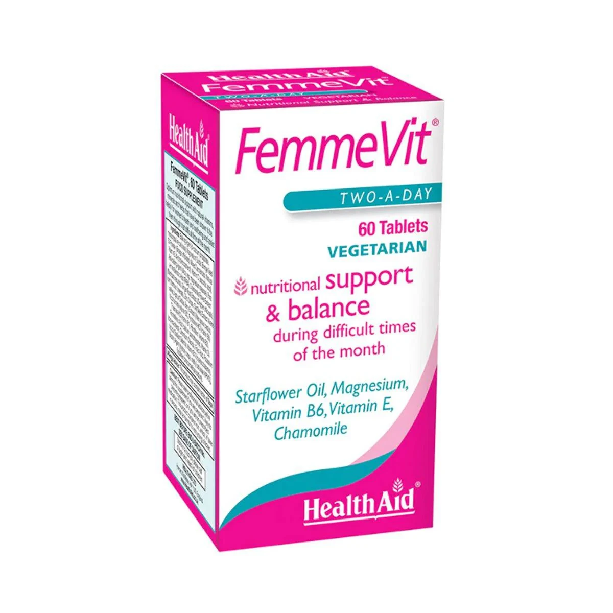 HealthAid FemmeVit Tablets provide nutritional support for women's health, helping maintain hormonal balance and reduce tiredness during the menstrual cycle. Contains vitamins, minerals, and plant extracts like Starflower Oil and Chamomile. Features