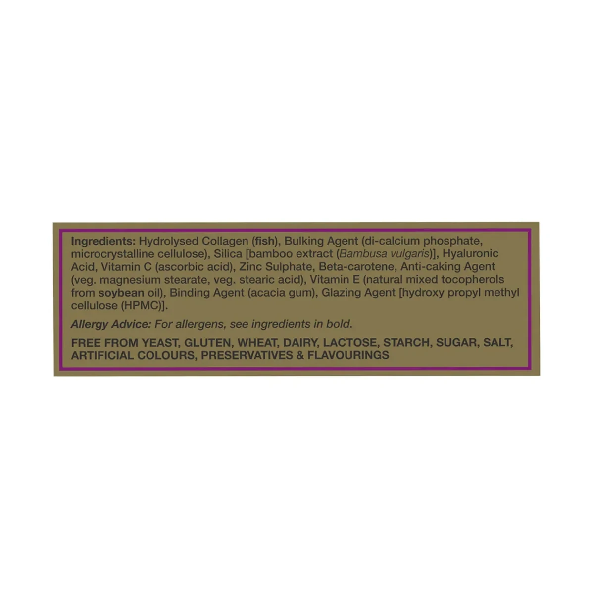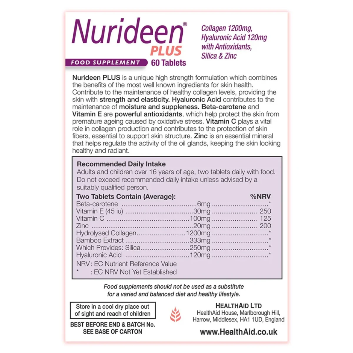 HealthAid Nurideen Plus Tablets are formulated with high-strength collagen and hyaluronic acid to support skin health. Rich in antioxidants, they protect against oxidative stress and promote skin elasticity and moisture retention. Key Features High potency collagen & hyaluronic acid Rich in antioxidants Supports skin health Reduces fine lines and wrinkles Stimulates collagen regeneration Protects against UV rays Improves skin firmness and suppleness Free from artificial colors and preservatives Hydrolysed Collagen (fish), Bulking Agent (di-calcium phosphate, microcrystalline cellulose), Silica [bamboo extract (Bambusa vulgaris)], Hyaluronic Acid, Vitamin C (ascorbic acid), Zinc Sulphate, Beta-carotene, Anti-caking Agent (veg. magnesium stearate, veg. stearic acid), Vitamin E (natural mixed tocopherols from soybean oil).HealthAid: Specialist in skin care supplements, known for high-quality collagen and hyaluronic acid products.Adults and children over 16 years, two tablets daily with food.Do not exceed recommended daily intake unless advised by a suitably qualified person.