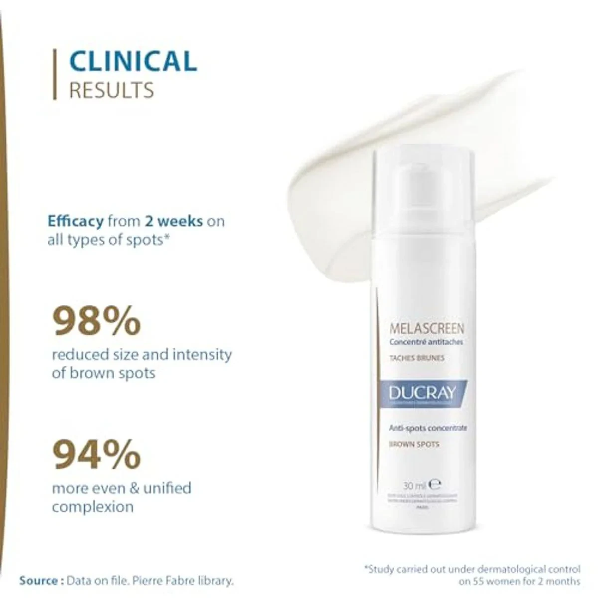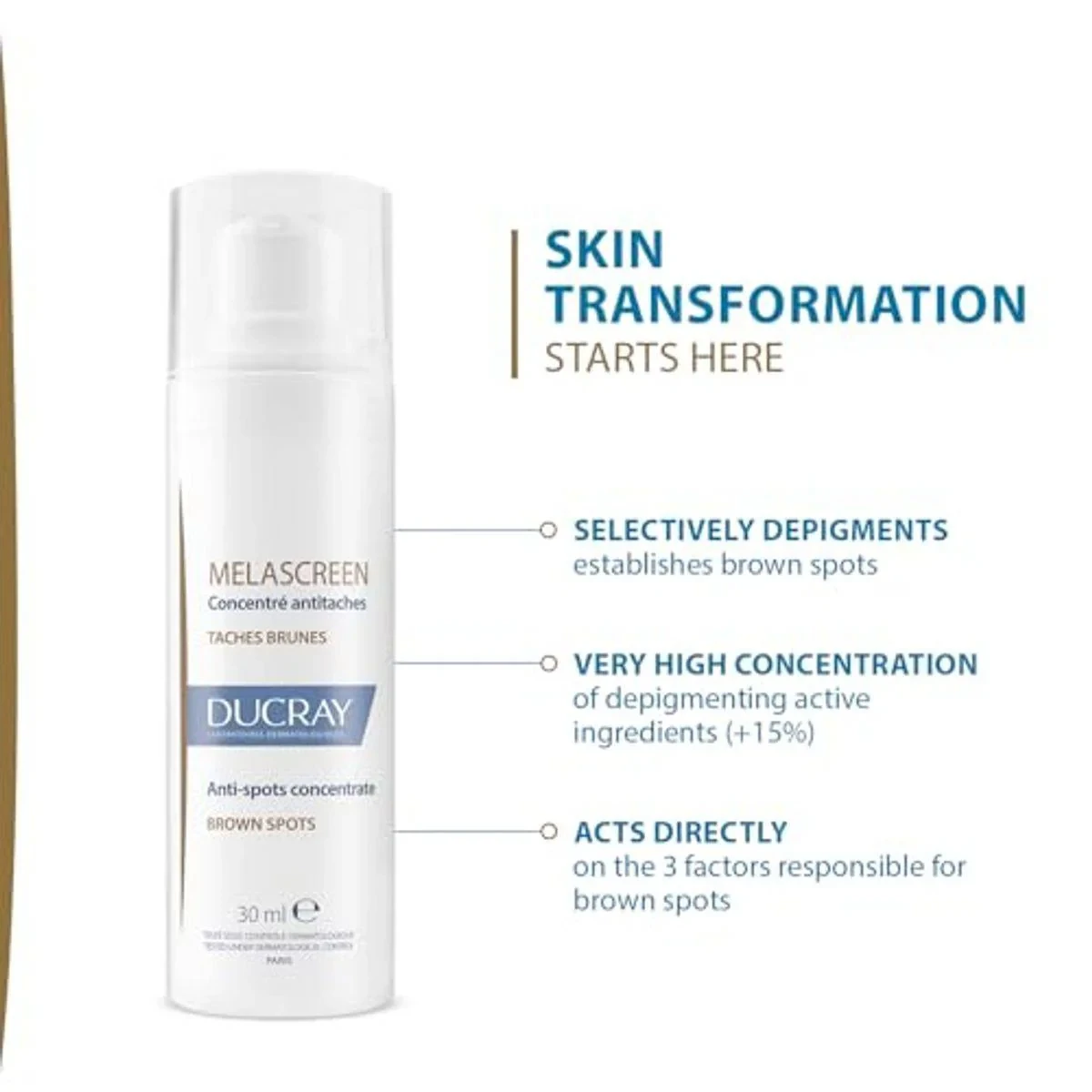 Ducray Melascreen Anti-Spots Concentrate is a dermatological treatment for dark spots and hyperpigmentation. It contains azelaic acid and glycolic acid to reduce spots and even skin tone. Suitable for all skin types, it is non-greasy and quickly absorbed. Ideal for daily use on affected areas. Key Features Light texture Non-greasy, non-sticky finish Good make-up base Depigments all types of brown spots Preserves skin's natural pigmentation Suitable for all skin types Fragrance-free Tested under dermatological control Water, Glycolic Acid, Niacinamide, Ascorbyl Glucoside, Citric Acid, Sodium Hydroxide, Butylene Glycol, Hydroxyethylcellulose, Sodium Hyaluronate, Phenoxyethanol, Fragrance, Azelaic Acid, Caprylic/Capric Triglyceride, Squalane, Propanediol, Glycerin, Glyceryl Stearate, Cetearyl Alcohol, Arachidyl Alcohol, Arachidyl Glucoside, Behenyl Alcohol, Benzoic Acid, Cetearyl Glucoside, Helianthus Annuus (Sunflower) Seed Oil, Hesperidin Methyl Chalcone, Sclerotium Gum, Sodium Chloride, Tocopherol.Ducray: Dermatological skincare solutions for all skin types, focusing on hyperpigmentation and spot correction.Apply twice daily to the face, neck, and decollete. Use sunscreen during the day.This Product Contains Alpha Hydroxy Acids (Ahas) That May Increase Your Skin'S Sensitivity To The Sun And Particularly The Possibility Of Sunburn. Use A Sunscreen, Wear Protective Clothing, And Limit Sun Exposure While Using This Product And For A Week Afterwards. Avoid Contact With Eyes And Mucous Membranes. If Irritation Occurs, Discontinue Use And Consult A Dermatologist. This Product May Not Be Suitable For All Skin Types, Particularly Sensitive Skin. It Is Recommended To Perform A Patch Test Before Applying To The Entire Face. Keep Out Of Reach Of Children.