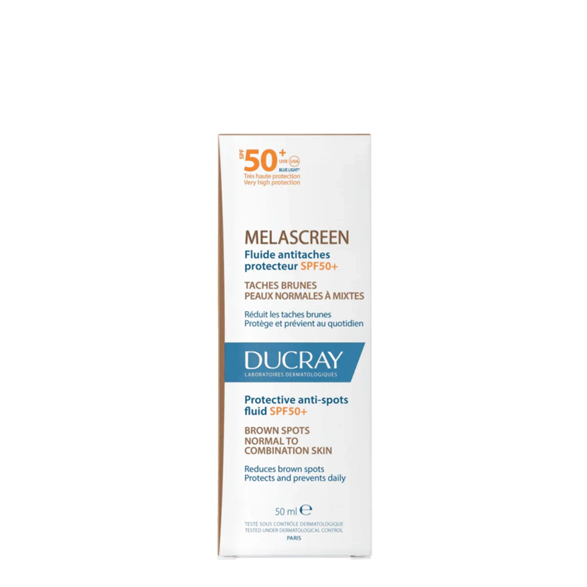 Ducray Melascreen Anti Spots Fluid SPF50+ is a high-protection sunscreen designed to reduce and prevent dark spots. Enriched with a patented broad-spectrum photoprotective system, it shields against harmful UV rays and blue light, preventing photoaging. Suitable for normal to combination skin, this fragrance-free fluid is ideal for daily use, providing a lightweight, non-greasy, and water-resistant formula. Perfect for those concerned about sun-induced dark spots and skin aging. Water (Aqua), C12 15 Alkyl Benzoate, Ethylhexyl Methoxycinnamate, Diethylamino Hydroxybenzoyl Hexyl Benzoate, Methylene Bis Benzotriazolyl Tetramethylbutylphenol, Cyclopentasiloxane, Glycerin, Butyl Methoxydibenzoylmethane, Diisopropyl Adipate, Diisopropyl Sebacate, Butylene Glycol Cocoate, C20 22 Alkyl Phosphate, C20 22 Alcohols, C20 22 Alcohols, C20 22 Alkyl Phosphate, C20 22 Alcohols, C20 22 Alcohols, Dimethicone, Decyl Glucoside, Polyacrylate 2 Crosspolymer, 1,2 Hexanediol, Caprylyl Glycol, Tocopheryl Glucoside, Sodium Hydroxide, Xanthan Gum, Caprylic/Capric Triglyceride, Acrylates/C10 30 Alkyl Acrylate Crosspolymer, Glyceryl Stearate, Benzoic Acid, Phenoxyethanol, Tocopherol, Azelaic Acid, Parfum (Fragrance).Ducray: Dermatological expertise for healthy skin and hair care solutions.Apply evenly to the face, neck, and decollete before sun exposure. Reapply frequently, especially after swimming or sweating.For External Use Only; Avoid Eye Contact; Discontinue Use If Irritation Occurs.