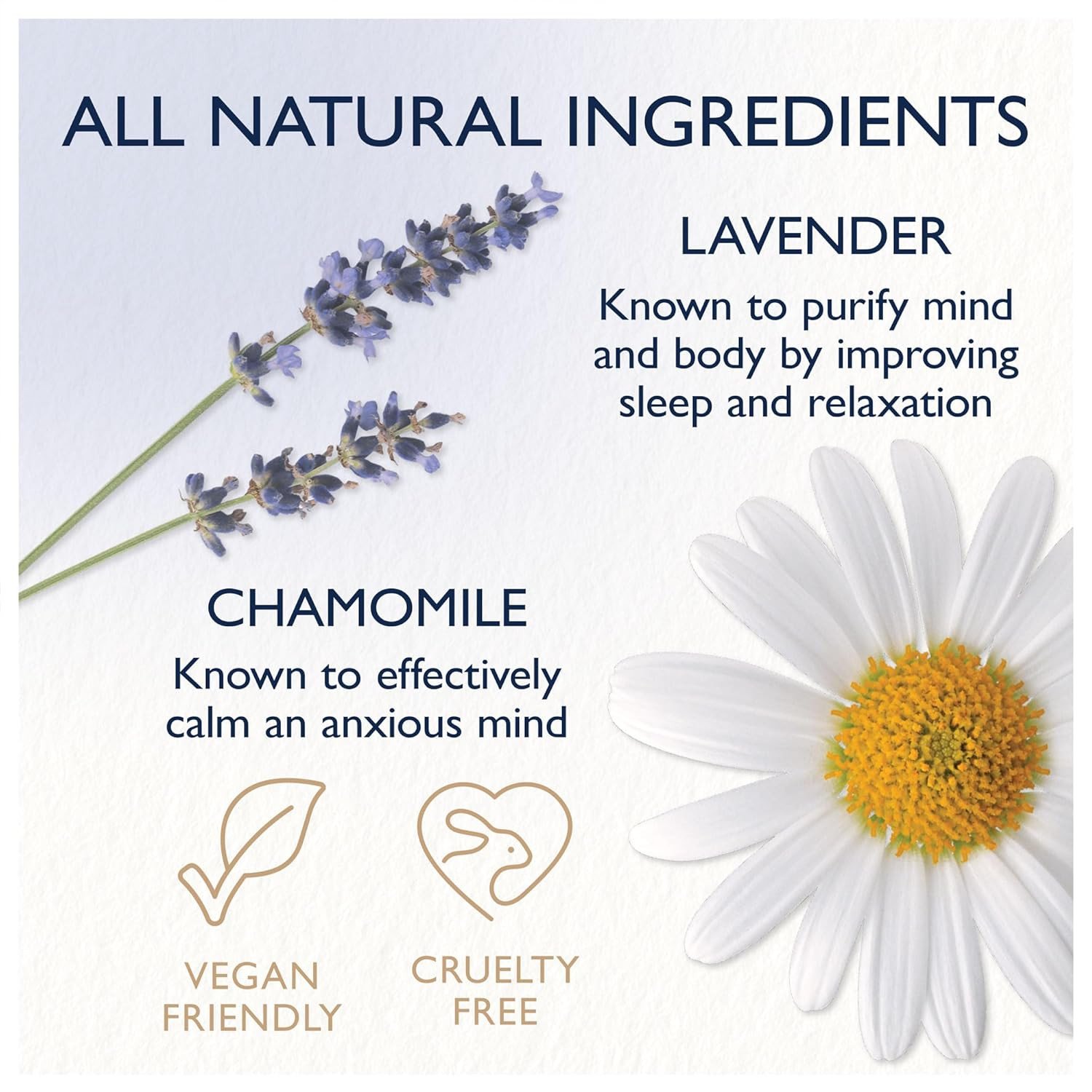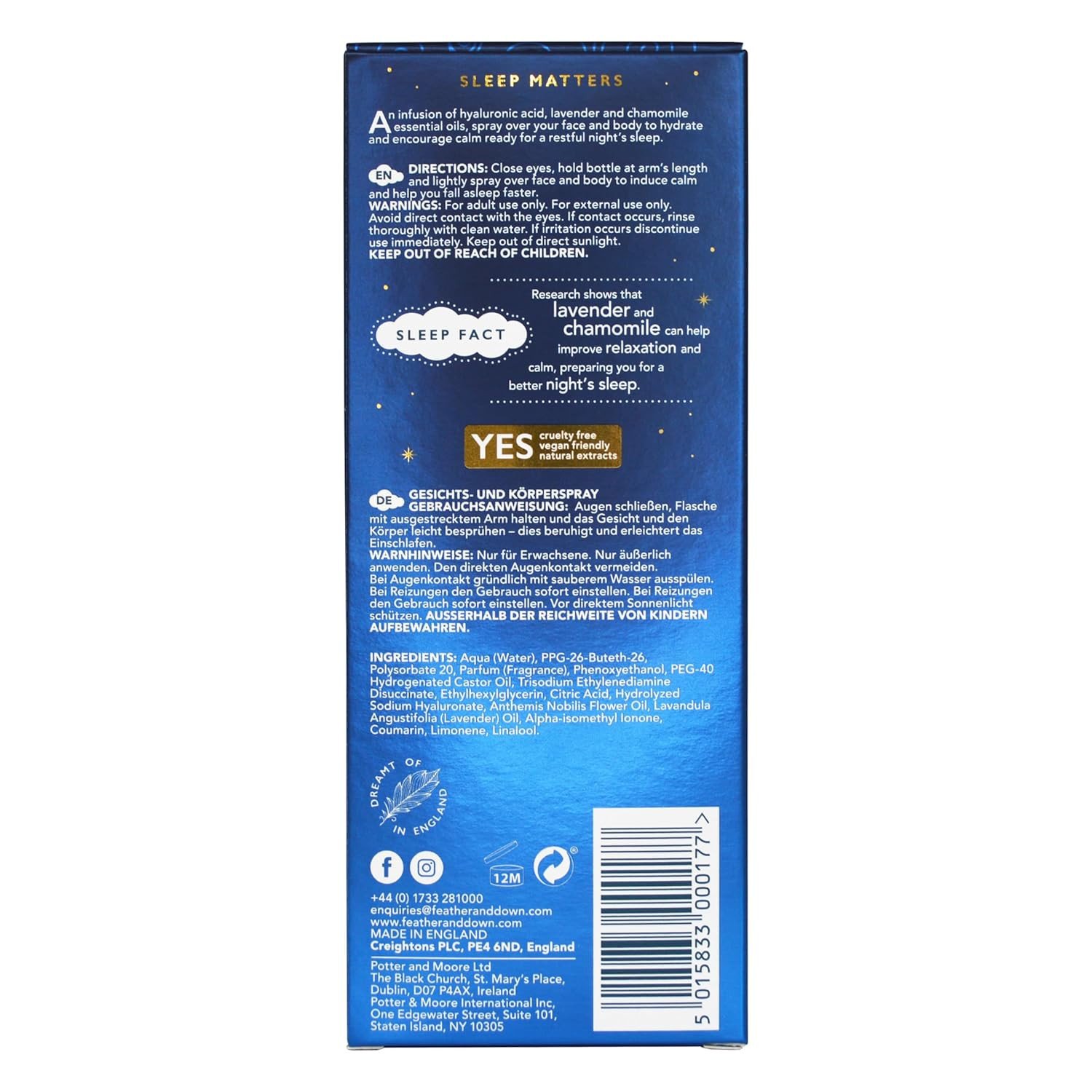 Feather & Down Sleep Face & Body Mist is infused with calming lavender and chamomile essential oils to promote relaxation and restful sleep. Enhanced with hyaluronic acid for skin hydration, it is vegan, cruelty-free, and suitable for all skin types. Key Features Calming lavender and chamomile essential oils Hydrating hyaluronic acid Promotes relaxation and restful sleep Vegan and cruelty-free Aqua (Water), Ppg 26 Buteth 26, Polysorbate 20, Parfum (Fragrance), Phenoxyethanol, Peg 40 Hydrogenated Castor Oil, Trisodium Ethylenediamine Disuccinate, Ethylhexylglycerin, Citric Acid, Hydrolyzed Sodium Hyaluronate, Anthemis Nobilis Flower Oil, Lavandula Angustifolia (Lavender) Oil, Alpha Isomethyl Ionone, Coumarin, Limonene, Linalool.Feather & Down specializes in sleep enhancing products with calming lavender and chamomile.Close eyes, hold the bottle at arm's length, and spray lightly over face and body before bedtime.For External Use Only. Avoid Contact With Eyes, And Discontinue Use If Irritation Occurs.
