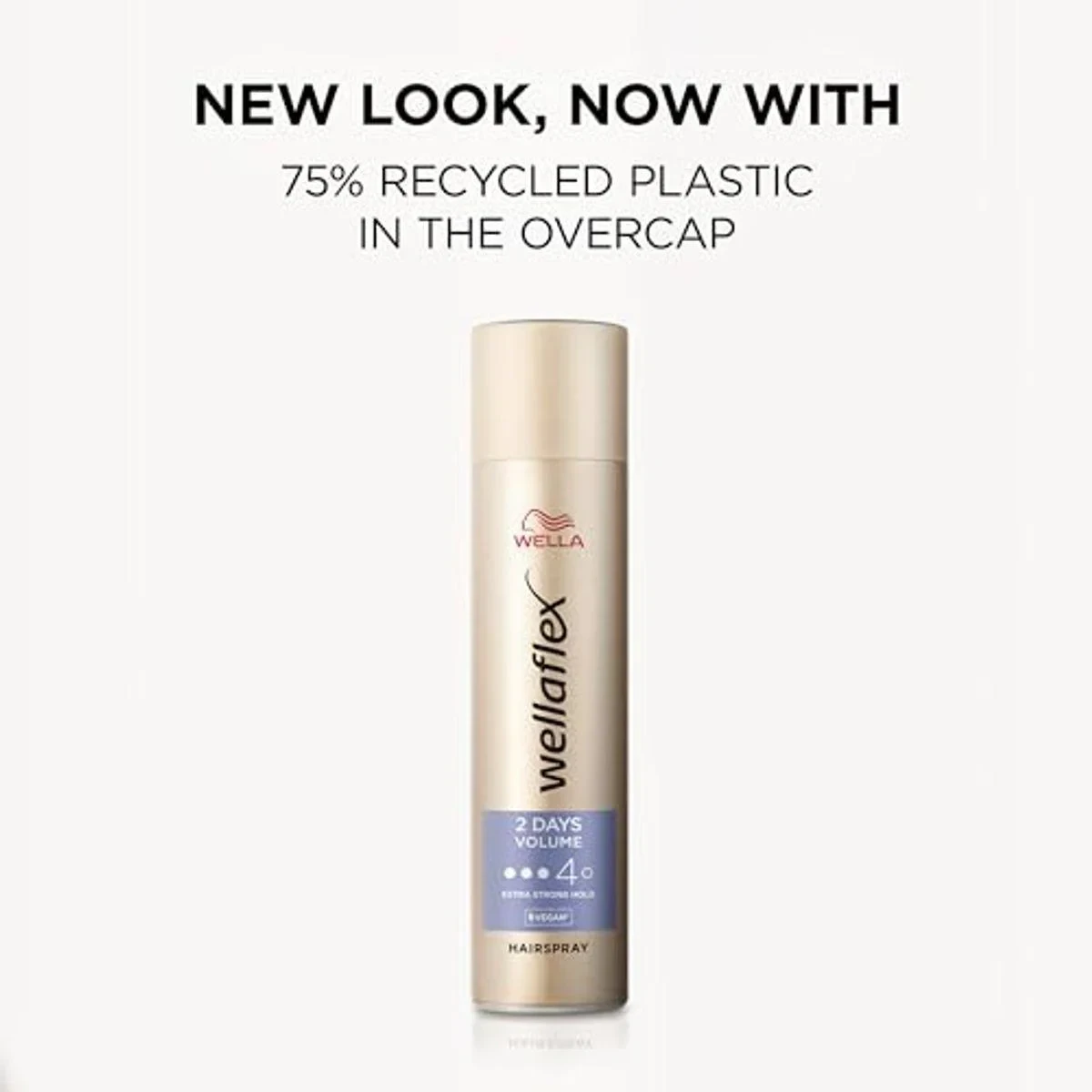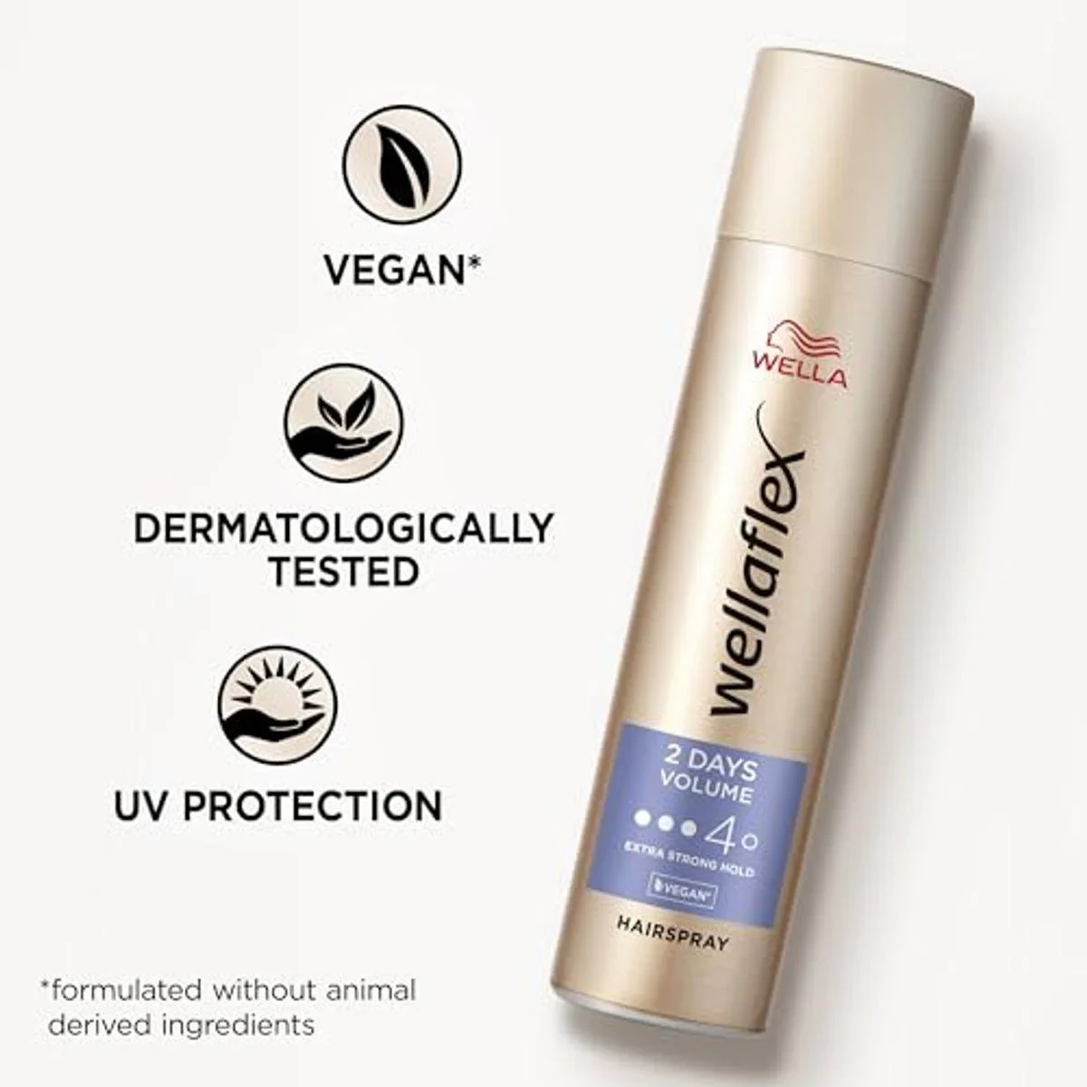 Wella Wellaflex 2 Days Volume Hairspray provides extra strong hold and volume for up to 48 hours. Its vegan formula is gentle on the scalp and dermatologically tested. Ideal for all hair types, it offers a natural feel without stiffness. Extra strong hold for up to 48 hours Flexible & lightweight formula Natural hair feel Gentle to scalp Vegan and dermatologically tested UV protection Dimethyl Ether, Alcohol Denat., Octylacrylamide/Acrylates/Butylaminoethyl Methacrylate Copolymer, Aqua/Water/Eau, Aminomethyl Propanol, PEG-12 Dimethicone, Parfum/Fragrance, VP/VA Copolymer, Isopropyl Alcohol, Linalool, Triethyl Citrate, Hexyl Cinnamal, Citronellol, Limonene, Macadamia Ternifolia Seed Oil, Benzyl SalicylateWella: Innovators in hair care and styling solutions.Hold can 30 cm away from hair and spray evenly, avoiding eyes.Danger. Extremely flammable aerosol. Pressurised container: May burst if heated. Keep away from heat, hot surfaces, sparks, open flames and other ignition sources. No smoking. Do not spray on an open flame or other ignition source. Do not pierce or burn, even after use. Protect from sunlight. Do not expose to temperatures exceeding 50°C. Keep out of reach of children. Do not inhale intentionally. Do not spray into the eyes. Use exclusively for intended purpose. The can must be completely empty before disposal.
