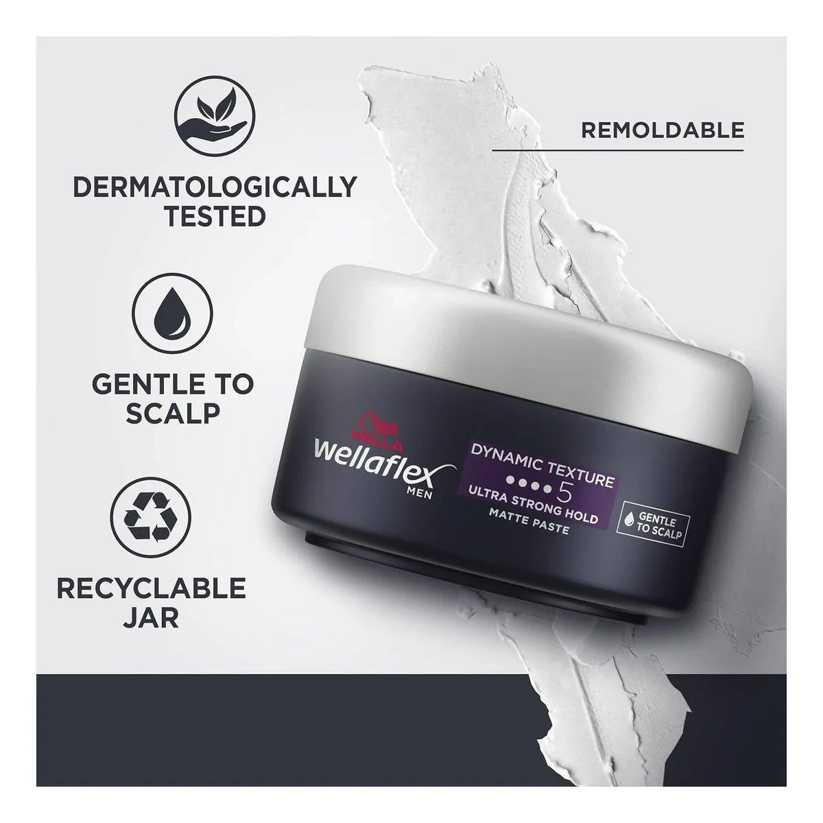 Wella Wellaflex Men Ultra Strong Hold Matte Paste provides dynamic texture and ultra strong hold for styling. Gentle to scalp and dermatologically tested. Key Features Ultra strong hold Matte finish Gentle to scalp Dynamic texture Non-sticky Dermatologically tested Recyclable jar Key Ingredients: Water, Carnauba Wax, Microcrystalline Wax, PVP/VA Copolymers (Styling Agents), Cetearyl Alcohol, Propylene Glycol, Fragrance.Wella is renowned for innovative hair care solutions, offering products that enhance style and texture.Apply To Dry Hair For Instant Texture And Hold.Gentle To Scalp.