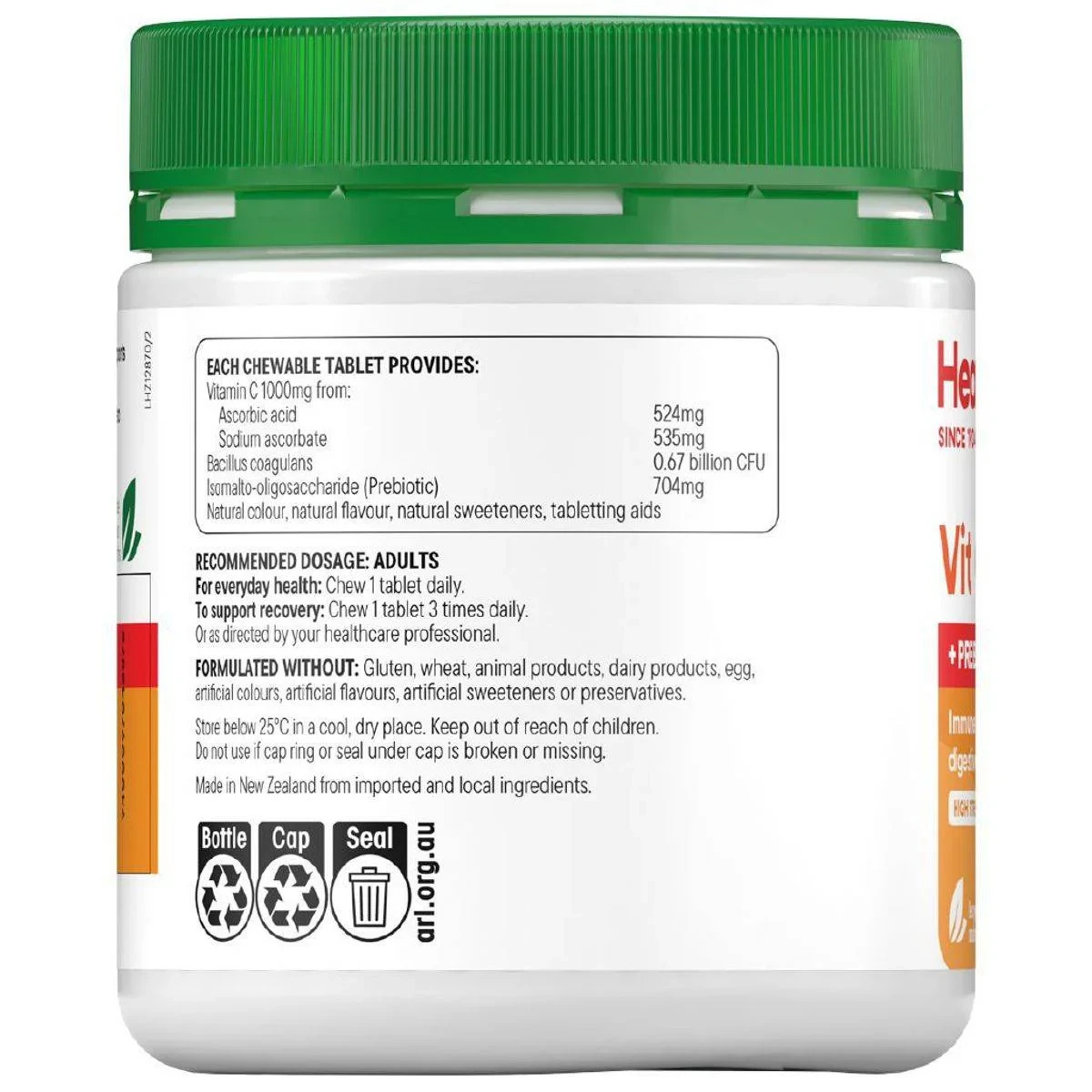 Healtheries Vit C 1000mg Plus Prebiotics & Probiotics offers high-strength Vitamin C to support immune and digestive health. With natural tropical flavors, it provides antioxidant benefits and helps maintain gut flora balance. Key Features High-strength Vitamin C 1000mg Contains prebiotics and probiotics Supports immune and digestive health Natural Mango and Passionfruit flavors No artificial colors, flavors, or sweeteners Great-tasting chewable tablets Recyclable bottle made from plants Vitamin C 1000mg (Ascorbic acid 524mg, Sodium ascorbate 535mg), Bacillus coagulans 0.67 billion CFU, Isomalto-oligosaccharide (Prebiotic) 704mg, Natural colour, Natural flavour, Natural sweeteners (sucrose, stevia, liquorice root extract), Tabletting aids.Healtheries: Experts in vitamins and supplements, supporting immune and digestive health.Chew 1 tablet daily for everyday health or 1 tablet 3 times daily for recovery.Keep out of reach of children.