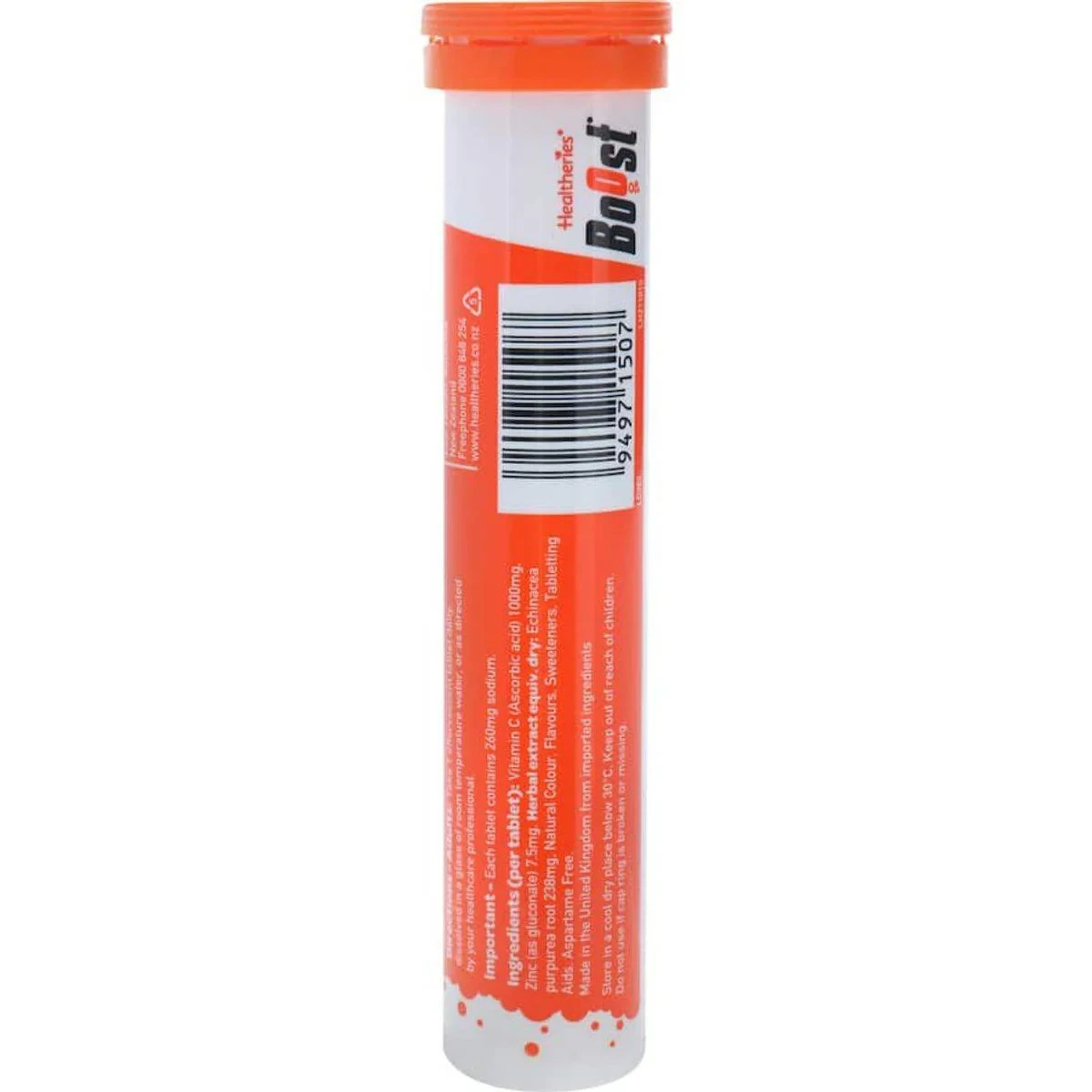Healtheries Boost Vitamin C Orange Effervescent Tablets are designed to support immune health with Vitamin C, Zinc, and Echinacea. Aspartame-free and made in the UK, these tablets dissolve in water to create a refreshing orange-flavored drink. Ideal for daily immune support, especially during times of stress. Key Features High strength immune support Effervescent tablets Orange flavour Contains Vitamin C, Zinc, and Echinacea Aspartame-free formulation Made in the United Kingdom Vitamin C (Ascorbic Acid) 1000Mg, Zinc (As Gluconate) 7.5Mg, Herbal Extract Equiv. Dry: Echinacea Purpurea Root 238Mg, Natural Colour, Flavours, Sweeteners, Tabletting Aids, Aspartame Free.Healtheries Boost Vitamin C Orange Effervescent Tablets are designed to support immune health with Vitamin C, Zinc, and Echinacea. Aspartame-free and made in the UK, these tablets dissolve in water to create a refreshing orange-flavored drink. Ideal for daily immune support, especially during times of stress.Adults: Take 1 Effervescent Tablet Daily, Dissolved In A Glass Of Room Temperature Water, Or As Directed By Your Healthcare Professional.Keep Out Of Reach Of Children. Do Not Use If Cap Ring Is Broken Or Missing.