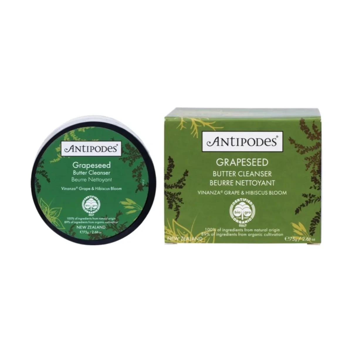 Antipodes Grapeseed Butter Cleanser is a luxurious skincare product designed to deeply cleanse and nourish the skin. Infused with Vinanza Grape and blue chamomile, it revitalizes and calms the skin while removing impurities. Ideal for dry and sensitive skin, this cleanser leaves your complexion fresh and radiant. Certified organic ingredients Sustainable New Zealand Vinanza Grape Suitable for very dry skin Deeply cleanses and exfoliates Contains blue chamomile and cocoa butter Olea Europaea* (Olive Oil), Butyrospermum Parkii (Shea Butter), Phormium Tenax* (Harekeke Flax Seed Oil), Cocos Nucifera* (Coconut Oil), Simmondsia Chinensis* (Jojoba Oil), Cera Alba (Beeswax), Silica, Theobroma Cacao (Cocoa Butter), Vitis Vinifera (Vinanza Grape Seed Extract), Sorbitan Isostearate, Matricaria Chamomilla (Blue Chamomile), Hibiscus Sabdarifa (Hibiscus Flower), Lavendula Officinalis (Lavender Oil), Naticide (Fragrance & Preservative), Benzyl Alcohol, Vitamin E.Antipodes: Pioneers in organic skincare, blending nature and science for radiant skin.Gently Massage Into Face, Neck, And Decolletage At Sunrise And Sunset. Rinse Off With Warm Water.For external use only. Discontinue use if irritation occurs. Use caution around the eye area.
