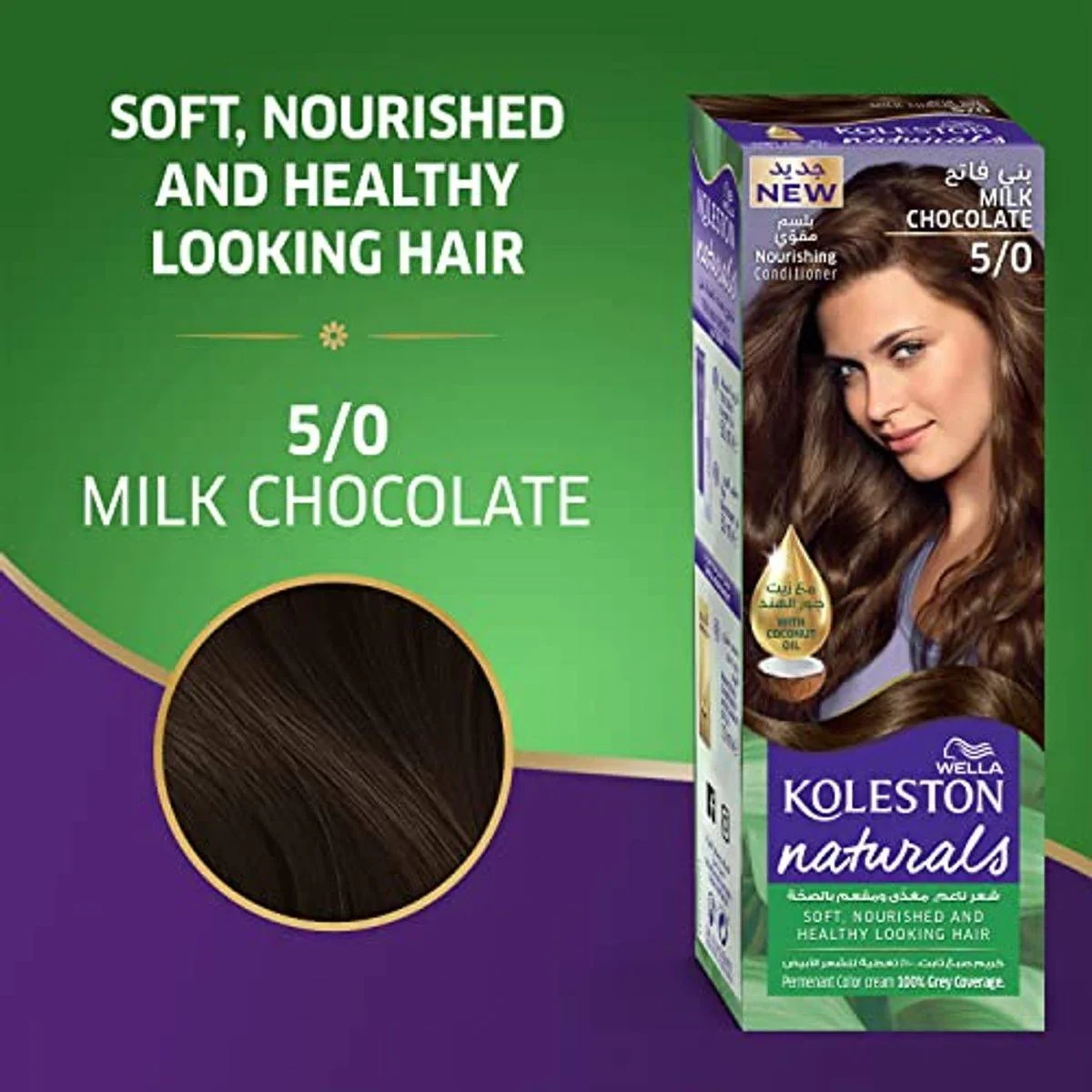 Wella Koleston Naturals Hair Color 5/0 Milk Chocolate offers intense color and healthy look for up to 6 weeks. Perfect grey coverage from root to tip, enriched with coconut oil. Key Features 100% grey coverage Contains coconut oil Soft, nourished, and healthy-looking hair Permanent color cream Chamomile Oil, Olive Oil, Coconut Oil.Wella: Innovators in hair care and color solutions, renowned for vibrant shades and nourishing formulas.Open, pour, mixPermanent color cream 100% grey coverage.