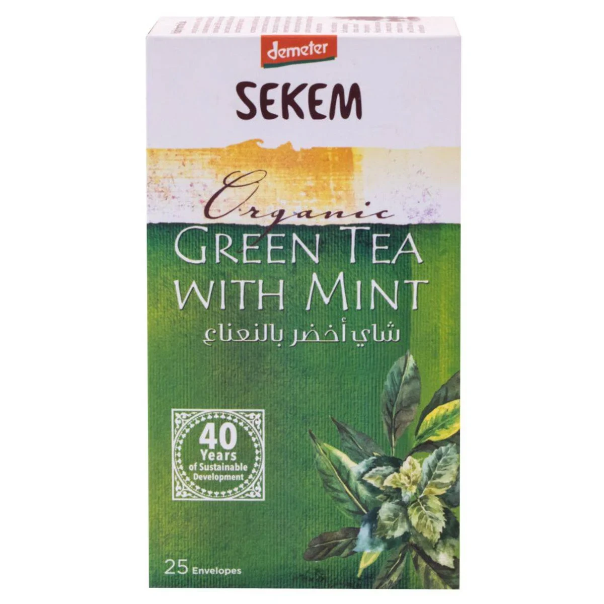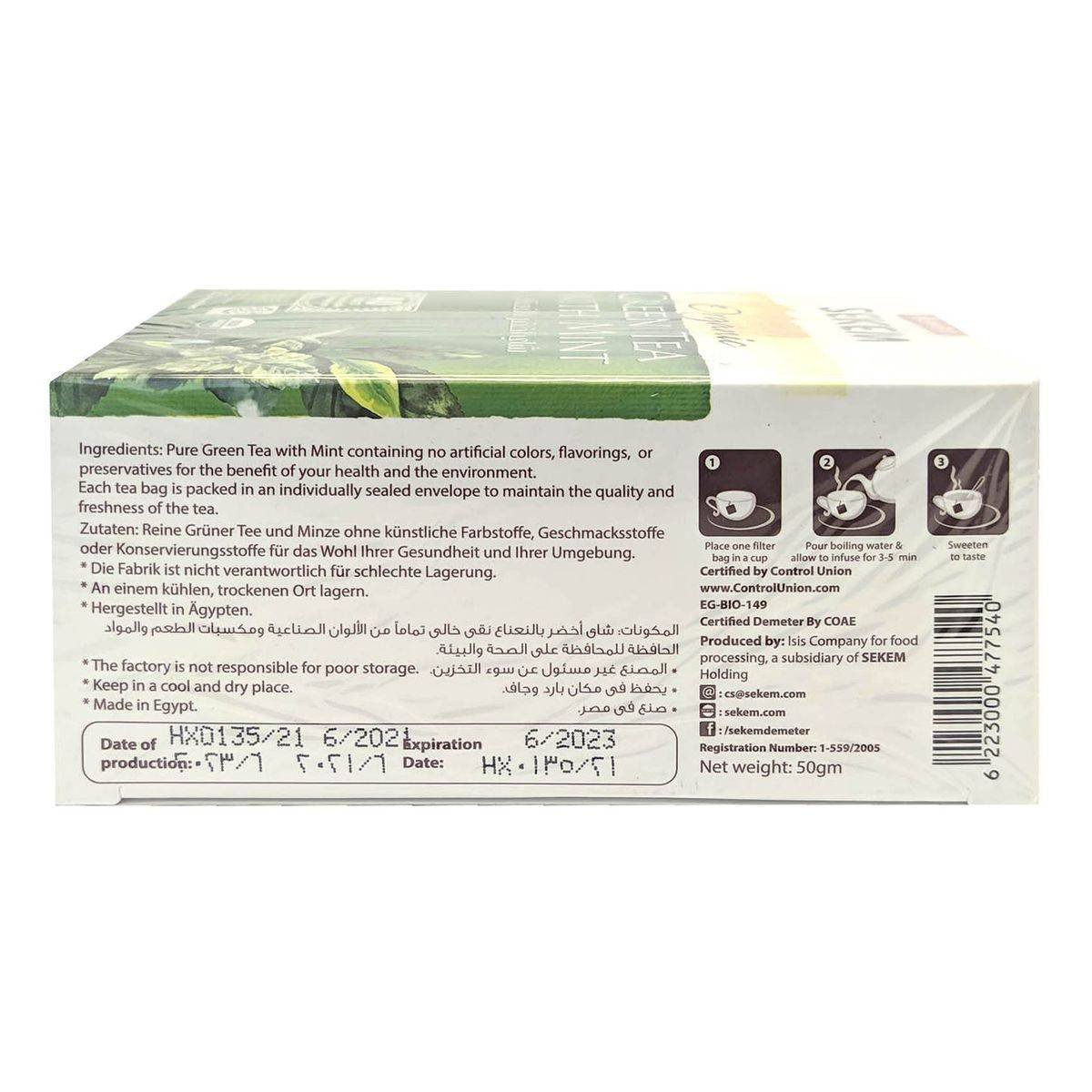 Sekem Organic Tea Green & Mint combines the refreshing taste of mint with the health benefits of green tea. Certified organic and biodynamic, this tea supports sustainable agriculture and fair trade principles. Ideal for those seeking a natural, invigorating beverage. Key Features Organic green tea with mint 25 envelopes per pack Demeter certified biodynamic farming USDA organic certification Economy of Love fair trade principle Organic Green Tea, Mint.SEKEM is a pioneer in sustainable development, cultivating the Egyptian desert with biodynamic agriculture for over 40 years.Place one tea bag in a cup. Pour boiling water over the tea bag. Steep for 3?5 minutes or to desired strength. Remove the tea bag and enjoy.Consultation: If pregnant, nursing, or taking medication, consult your healthcare practitioner before use. Not a substitute for medical treatment.
