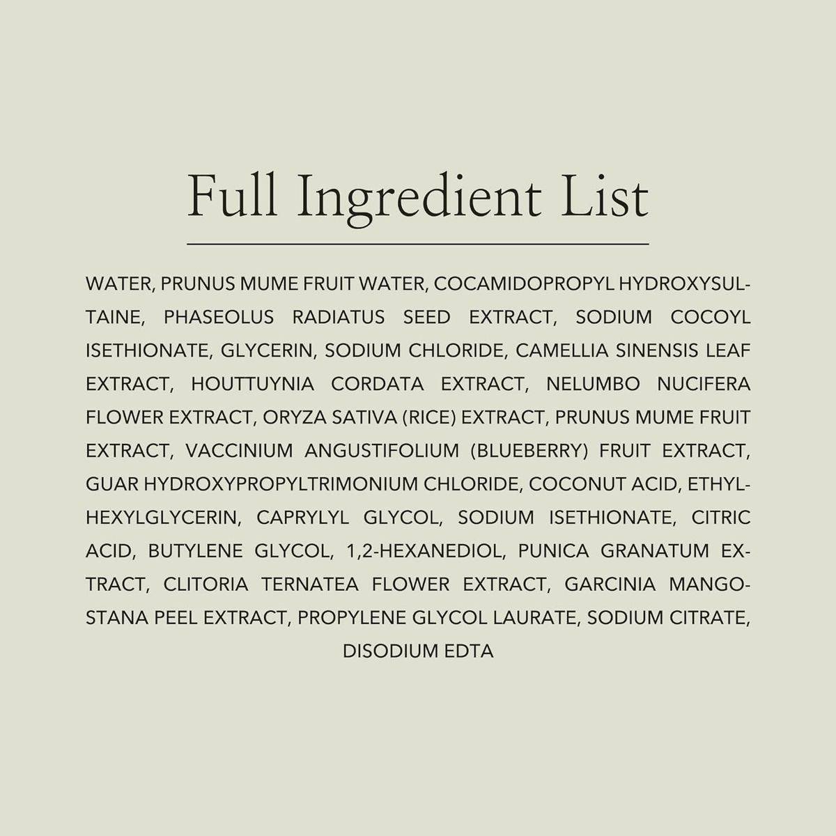 Water, Prunus Mume Fruit Water, Cocamidopropyl Hydroxysultaine, Phaseolus Radiatus Seed Extract, Sodium Cocoyl Isethionate, Glycerin, Sodium Chloride, Camellia Sinensis Leaf Extract, Houttuynia Cordata Extract, Nelumbo Nucifera Flower Extract, Oryza Sativa (Rice) Extract, Prunus Mume Fruit Extract, Vaccinium Angustifolium (Blueberry) Fruit Extract, Guar Hydroxypropyltrimonium Chloride, Coconut Acid, Ethylhexylglycerin, Caprylyl Glycol, Sodium Isethionate, Citric Acid, Butylene Glycol, 1,2-Hexanediol, Hydroxyacetophenone, Dextrin, Melia Azadirachta Leaf Extract, Melia Azadirachta Flower Extract, Gardenia Florida Fruit Extract, Propylene Glycol Laurate, Sodium Citrate, Disodium Edta.Beauty of Joseon is renowned for its skincare products that blend traditional Korean ingredients with modern formulations.Dispense A Suitable Amount Onto Moistened Hands, Massage Onto The Face, And Rinse Thoroughly With Lukewarm Water.For external use only. Avoid contact with eyes. Discontinue use if irritation occurs.
