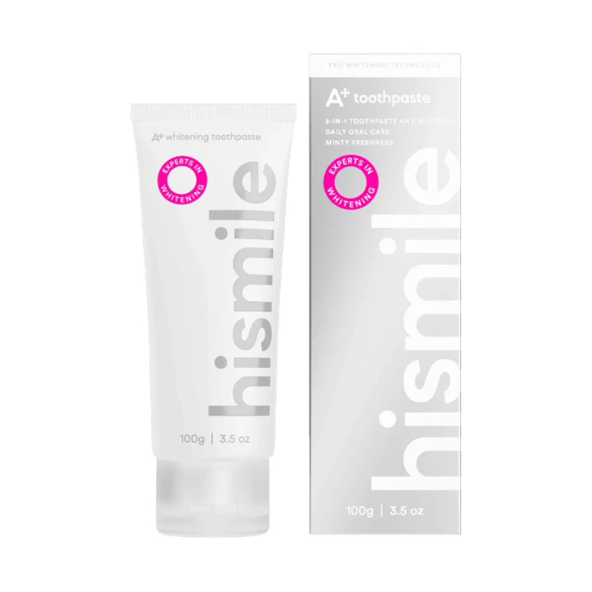 Hismile's A+ Toothpaste is designed to help maintain a whiter smile while providing minty freshness. It features a 2-in-1 formula for daily oral care and teeth whitening. Key Features 2-In-1 Toothpaste And Whitener Daily Oral Care Minty Freshness Not intended for use by children Glycerin, Hydrated Silica, Propanediol, Aqua/Water, Xylitol, Tetrasodium Pyrophosphate, Sodium Hexametaphosphate, Disodium Phosphate, Pentasodium Triphosphate, Hydroxyapatite, Pvp, Flavour/Aroma, Cellulose Gum, Calcium Glycerophosphate, Sodium Methyl Cocoyl Taurate, Sodium Lauroyl Sarcosinate, Lauryl Glucoside, 1,2 Hexanediol, Sucralose, Sodium Gluconate, Methyl Diisopropyl Propionamide, Theobromine, Magnolia Officinalis Bark Extract, Titanium Dioxide (Ci 77891), Anethole, Carvone, Menthol, Mentha Piperita Oil.Innovative oral care brand specializing in teeth whitening solutions.Apply toothpaste to toothbrush. Brush for 2 minutes. Expel excess toothpaste.Product Is Not Intended For Use By Children. Do Not Use If Pregnant Or Breastfeeding. Do Not Swallow. Do Not Use In Eye Area. For Cosmetic Use Only.