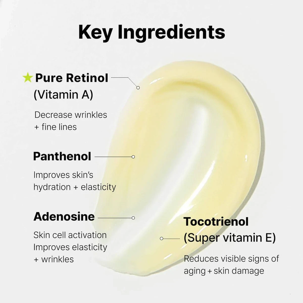 COSRX The Retinol 0.1 Cream is designed for first-time retinol users to combat early signs of aging. It contains pure retinol, panthenol, and super vitamin E to reduce wrinkles, improve elasticity, and moisturize the skin. Ideal for sensitive skin, it provides a gentle introduction to retinol with visible results. Key Features Decreases wrinkles and fine lines Improves skin's hydration and elasticity Activates skin cells Reduces visible signs of aging and skin damage Contains pure retinol (Vitamin A) Includes Super Vitamin E and Panthenol Fragrance-free and alcohol-free Suitable for first-time retinol users Water, Caprylic/Capric Triglyceride, Propanediol, Glycerin, Tocopheryl Acetate, Cetearyl Alcohol, Trehalose, Panthenol, Butyrospermum Parkii (Shea) Butter, Glycine Soja (Soybean) Oil, Ammonium Acryloyldimethyltaurate/Vp Copolymer, Dimethicone, Glyceryl Polymethacrylate, Helianthus Annuus (Sunflower) Seed Oil, Polyglyceryl 10 Stearate, Hydrogenated Lecithin, Hydroxyethyl Acrylate/Sodium Acryloyldimethyl Taurate Copolymer, Carbomer, Tromethamine, Glyceryl Stearate, Polysilicone 11, Sodium Sulfite, Tocopherol, Daucus Carota Sativa (Carrot) Root Extract, Retinol(0.1%), Allantoin, Glyceryl Caprylate, Oryza Sativa (Rice) Bran Wax, Tocotrienols, Stearic Acid, Polyglyceryl 3 Methylglucose Distearate, Palmitic Acid, Disodium Edta, Ethylhexylglycerin, Adenosine, Sorbitan Isostearate, Elaeis Guineensis (Palm) Oil, Bht, Beta Carotene, Myristic Acid, Lauric Acid, Ascorbic Acid, Limnanthes Alba (Meadowfoam) Seed Oil, 3 O Ethyl Ascorbic Acid, Glutathione, Sodium Hyaluronate, 1,2 Hexanediol, Hydrolyzed Hyaluronic Acid, Sodium Hyaluronate Crosspolymer, Hyaluronic Acid, Sodium Acetylated Hyaluronate.Leading Korean skincare brand known for innovative, effective, and affordable products.Apply a small amount with your ring finger over the face and neck, focusing on areas with wrinkle concerns. Use three times per week initially, then gradually increase.Caution Is Advised As Retinol Can Cause Irritation, Especially Around The Eyes And Mouth. It Is Recommended To Avoid Retinoid Products When Pregnant Or Breastfeeding.