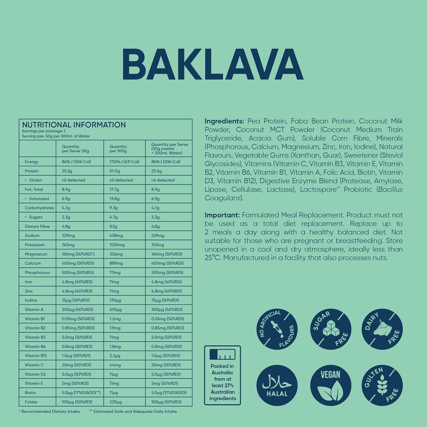A high-protein, vegan meal replacement shake in a globally-inspired Baklava flavor. Designed to support weight management and gut health. Features: 23g+ Plant Protein (Pea/Faba Bean). No Added Sugar/Low Calorie. Enriched with Vitamins, Minerals, Prebiotics, and Probiotics. Delicious, creamy texture. Key Ingredients: Plant Protein Blend (Pea Protein, Faba Bean Protein), Coconut Milk Powder, Soluble Corn Fibre, Minerals (P, Ca, Mg, Zn, Fe, I), Vitamins (full blend, e.g., Vit C, D3, B-vitamins), Natural Baklava Flavor, Sweetener (Steviol Glycosides), Prebiotics/Probiotics (LactoSpore), Digestive Enzymes.Daily Shake is a wellness brand focused on high-protein, vegan meal replacement shakes. The brand emphasizes clean nutrition, containing prebiotics, probiotics, vitamins, and minerals, with globally-inspired flavors, designed to support weight loss and gut/skin health.Add 50g (2 level scoops) to 300mL of cold water. Shake until completely dissolved. Consume immediately as a meal replacement.Not Suitable As A Sole Source Of Nutrition. Consult A Healthcare Professional Before Starting A Weight Loss Program. Allergens: Contains Tree Nuts (Coconut), Faba Beans. May Contain Traces Of Other Allergens.