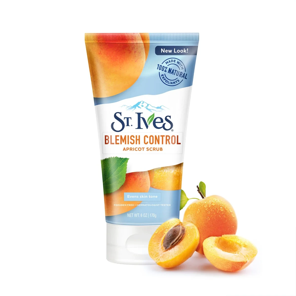 St. Ives Naturally Clear Apricot Scrub, Blemish and Blackhead Control. A delicious face scrub that smells of fuzzy apricots, helps to exfoliate skin and deeply cleans pores for fresher than fresh skin. Our Acne Control Apricot scrub contains salicylic acid to help prevent new blackheads and blemishes from forming. Made with 100Percent natural exfoliants (like crushed walnut shell) for a gentle, deep cleanse and of course there's apricot extract too which is known to leave feeling s. Active Ingredient: Salicylic Acid (2%). Inactive Ingredients: Water, Glycerin, Hydrated Silica, Juglans Regia (Walnut) Shell Powder, Sodium Laureth Sulfate, Prunus Armeniaca (Apricot) Fruit Extract, Fragrance, Disodium EDTA, Citric Acid.St. Ives (owned by Unilever) is a popular US skincare brand. This scrub is formulated with Salicylic Acid and Apricot kernel powder to target blemishes.Dampen face and apply scrub. Massage gently in circular motions, avoiding the eye area. Rinse thoroughly. Use 3-4 times a week.For external use only. Avoid eye area. Contains Salicylic Acid (BHA). Limit use to 3-4 times per week to avoid over-exfoliation.