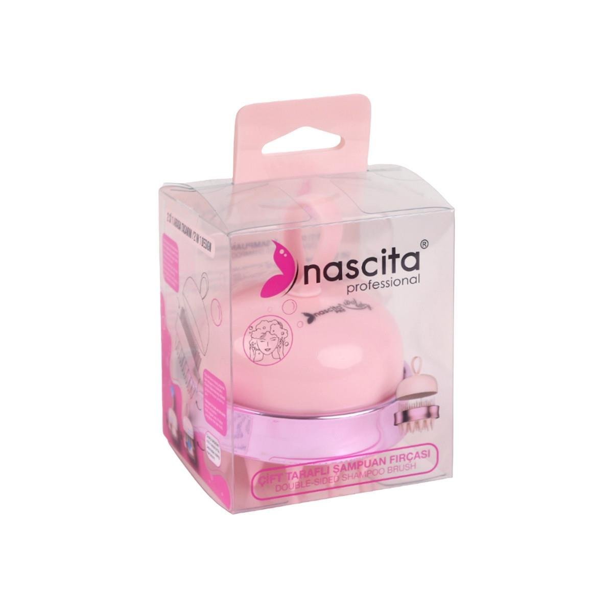 فرشاة شامبو مزدوجة 60 من ناشيتا، جانب للتدليك وآخر للتنظيف، مقبض مريح وغطاء للحفظ.