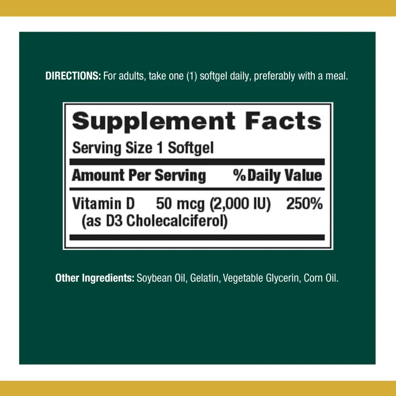 Natures Bounty Vitamin D 2000IU 150 SoftgelVitamin D3 (Cholecalciferol)Higher potency softgels delivering 2000IU of Vitamin D for enhanced bone and immune health support, in a pack of 150 softgels.As labelled or as directed by healthcare practionerDo not exceed the recommended dose or as advised by health care practioner