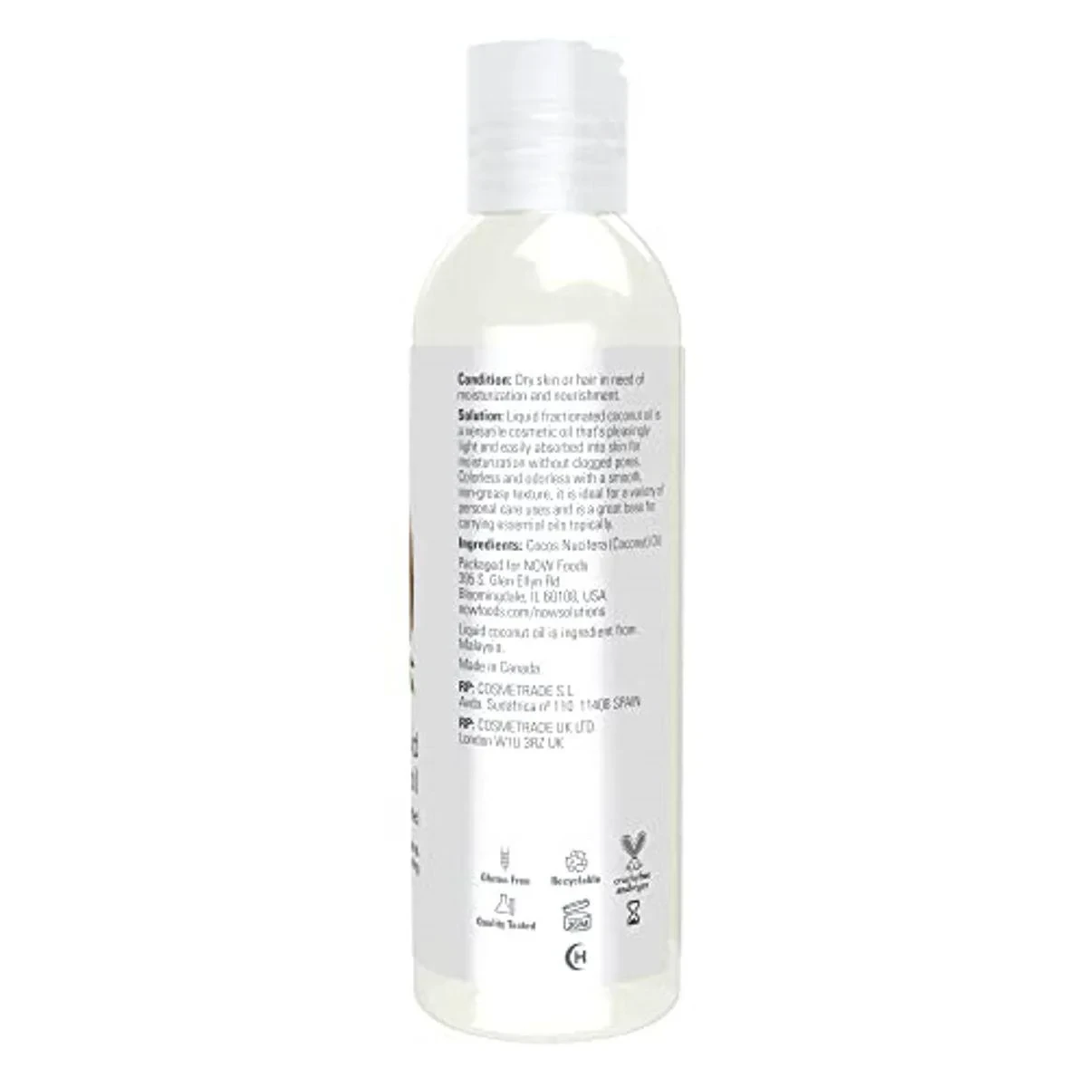 NOW Solutions Liquid Coconut Oil is a versatile cosmetic oil that provides comprehensive moisturization without clogging pores. It is light, easily absorbed, and suitable for dry skin or hair care, massage therapy, and as a carrier oil for essential oils. The product is colorless, odorless, and non-greasy, making it ideal for various personal care uses. It helps soften dry, damaged hair and adds a healthy shine. Key Features Revitalizing Skin & Hair Vegan Lightweight & fast absorbing Non-GMO Project Verified Suitable for all skin types Colorless and odorless Paraben-free Cocos Nucifera (Coconut Oil)NOW Foods offers natural personal care products, known for cruelty-free skincare and aromatherapy solutions.Apply as needed for body, face, and hair care.Avoid direct contact with eyes. Do not apply to broken or irritated skin. Discontinue use and consult a healthcare practitioner if irritation occurs.