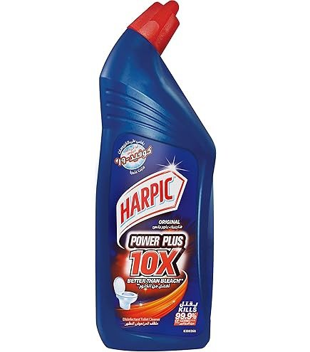 Harpic Power Plus 10X Toilet Cleaner offers superior cleaning with its enhanced formula, leaving your toilet clean, shiny, and free from all types of stains including limescale and rust. It ensures a pleasant fragrance and fresh look. Key Features Most powerful cleaner with thicker formula Removes limescale, yellow, hard water, faecal, urine, soap, oily, rust stains, and dirt Kills 99.9% of germs Leaves a pleasant fragrance Ready-to-use liquid, no mixing required Hydrochloric Acid (approx. 10%), Non-ionic Surfactants, Perfume, Water.Harpic Power Plus is a strong liquid cleaner offering superior cleaning power compared to regular bleach, targeting deep stains and germs.Lift the toilet seat. Direct the nozzle under the rim and squeeze the bottle to apply evenly around the bowl. Leave for 10 minutes (or 60 minutes for deep disinfection). Brush and flush.DANGER: Causes severe skin burns and eye damage. Keep out of reach of children. Do not swallow. Do not mix with bleach or other cleaning products.