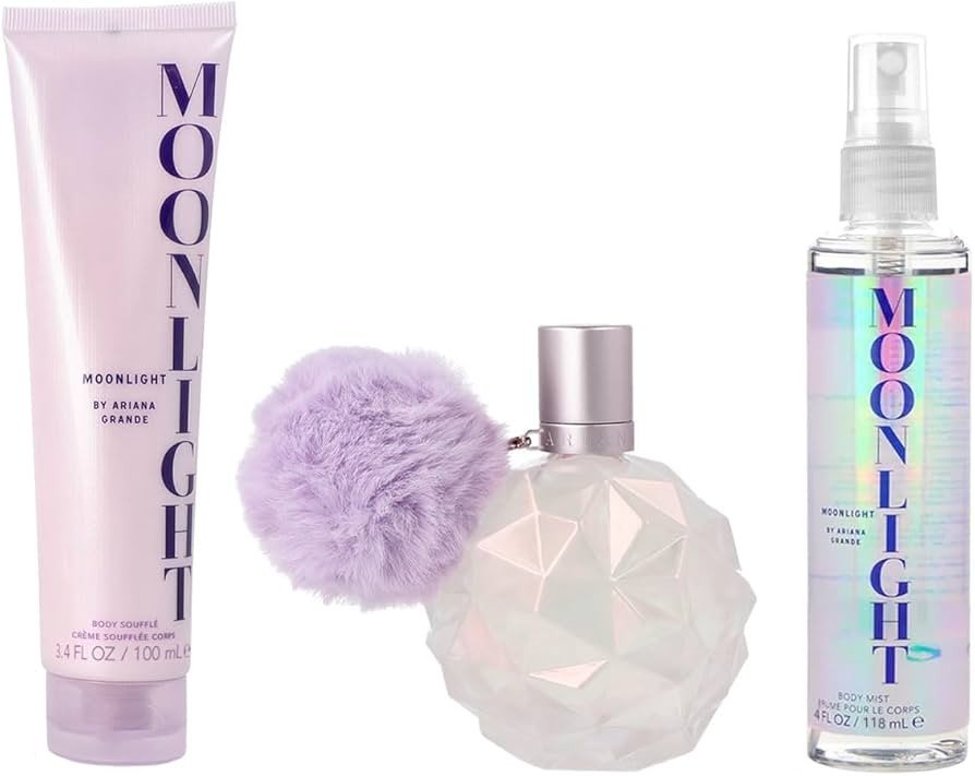 Ariana Grande Moonlight Set includes EDP, Body Mist, and Body Souffle. Features floral fruity notes like plum and marshmallow. Ideal for daily use and all skin types. Features Floral fruity fragrance Notes of plum, black currant, marshmallow Suitable for all skin types Ideal for daily use and various occasions Alcohol Denat, Aqua, Fragrance.Ariana Grande, known for enchanting fragrances and stylish gift sets.EDP/Mist: Spray onto pulse points or body. Body Souffle: Apply generously to skin.Flammable. For external use only. Avoid contact with eyes. Keep away from heat/open flame.