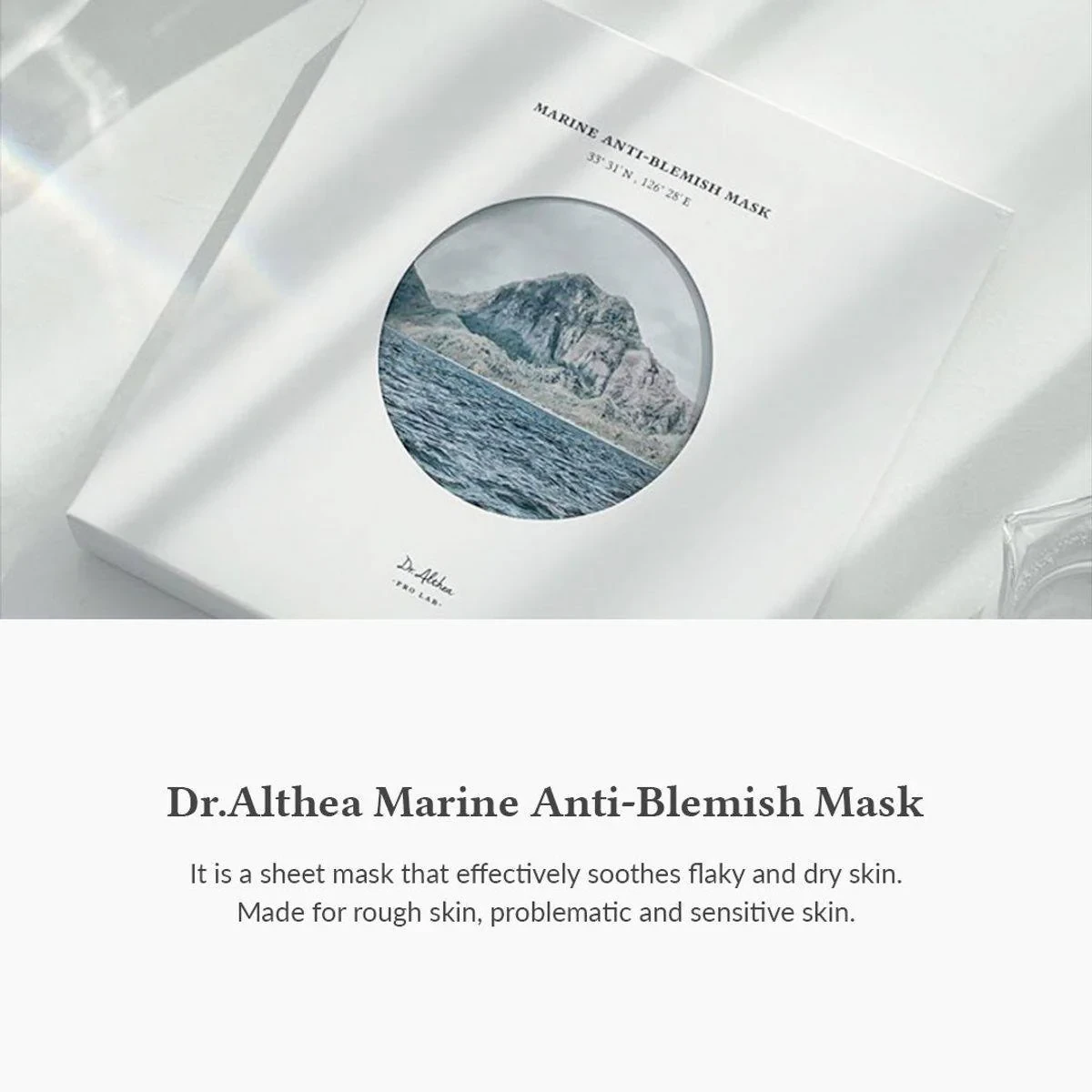 This Marine Anti-Blemish Mask is designed to soothe irritated and sensitive skin while supplying essential nutrients for skin repair. Suitable for all skin types, especially acne-prone skin. Features 100% Vegan sheet material Enhances skin barrier and immunity Soothes flaky and dry skin Suitable for rough, problematic, and sensitive skin Bifida Ferment Lysate, Saccharomyces Ferment Lysate Filtrate, Lactobacillus Ferment Lysate.Dr. Althea: Innovators in skincare solutions with a focus on sensitive and problematic skin.Apply The Mask To Clean Skin And Leave On For 15-20 Minutes. Remove And Gently Pat Remaining Essence Into Skin.For external use only. Avoid contact with eyes. Do not apply to broken or inflamed skin. Discontinue use if signs of irritation appear. Keep out of reach of children.