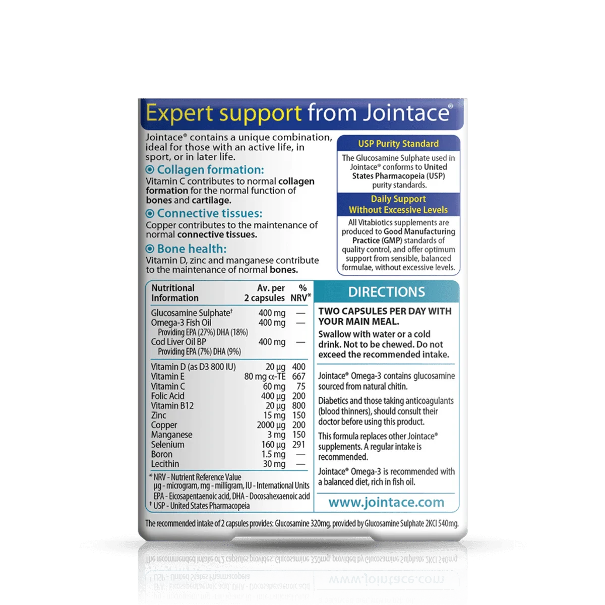 Vitabiotics Jointace Omega3 capsules are designed to support joint health and mobility. Enriched with omega-3 fatty acids, glucosamine, and chondroitin, they help maintain healthy joints, reduce stiffness, and promote flexibility. Features Supports joint health and mobility Contains Omega-3 fatty acids for joint lubrication Includes glucosamine for cartilage health Promotes joint flexibility and comfort Helps reduce joint stiffness Glucosamine Sulphate (as Potassium Chloride) (from Crustacean), Cod Liver Oil (from Fish), Omega-3 Fish Oil (from Fish), Vitamin E (DL-Alpha Tocopheryl Acetate), Vitamin C (Ascorbic Acid), Orange Oil, Zinc Sulphate, Vitamin B12 (Cyanocobalamin), Lecithin (from Soya), Sodium Borate, Manganese Sulphate, Copper Sulphate, Vitamin D3 (Cholecalciferol), Folic Acid (as Pteroylmonoglutamic Acid), Sodium Selenite.Vitabiotics: Leading UK brand in vitamins and supplements, known for innovative health solutions.Two capsules per day with your main meal. Swallow with water or a cold drink. Not to be chewed.Diabetics and those taking anticoagulants (blood thinners), should consult their doctor before using this product.