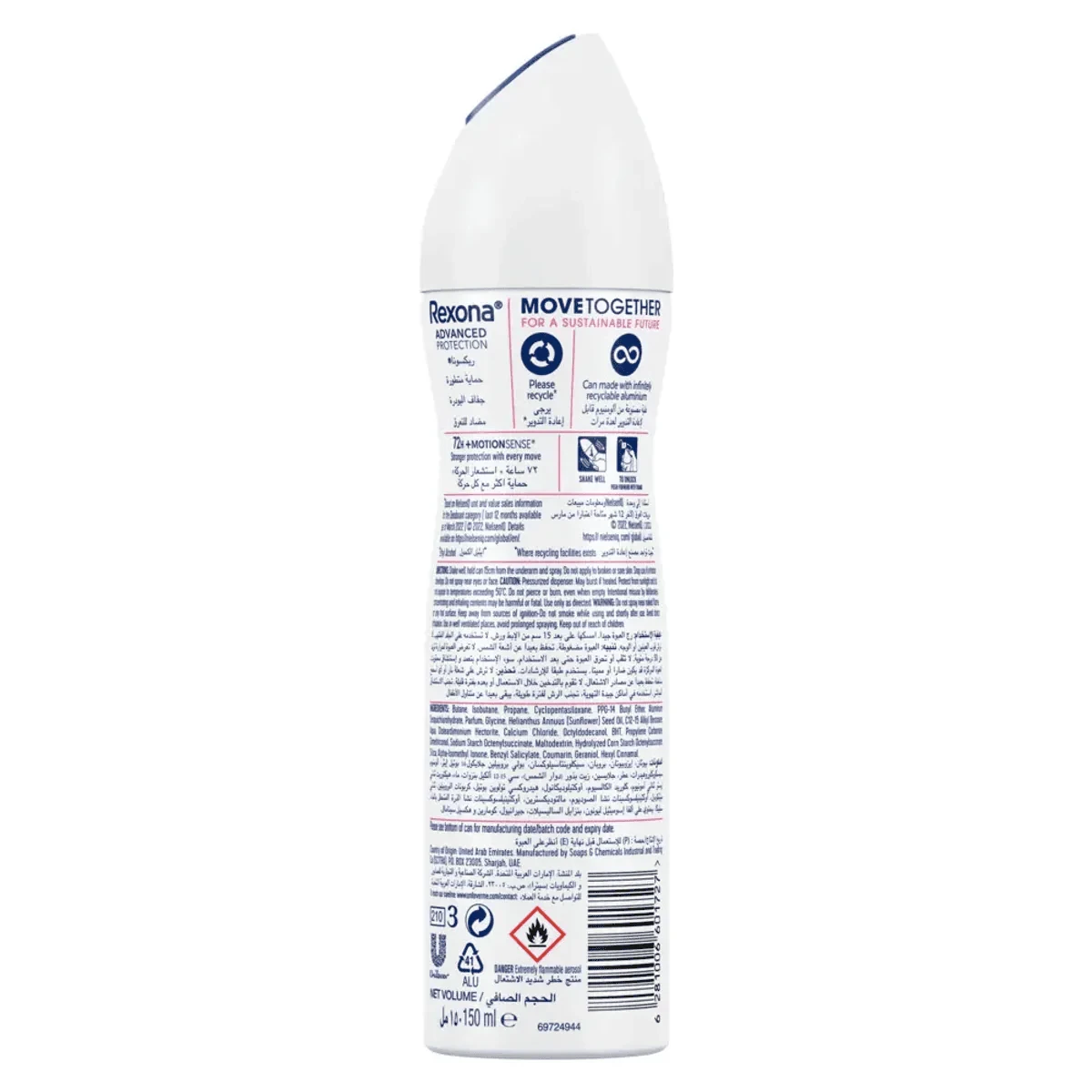 Rexona Deodorant Spray 72H Powder Dry offers advanced protection with MotionSense technology. It provides 72-hour protection against sweat and odor, keeping you fresh and confident all day. The alcohol-free formula is gentle on the skin, making it suitable for daily use. Key Features 72-hour protection against sweat and odor MotionSense technology activated by movement Alcohol-free formula Instantly dries for quick application Butane, Isobutane, Propane, Cyclopentasiloxane, Aluminum Chlorohydrate, Fragrance, Dimethicone, Ethylhexylglycerin, PPG-14 Butyl Ether, Glycine, Disteardimonium Hectorite, Calcium Chloride, Propylene Carbonate, Dimethiconol, BHT, Citral, Hexyl Cinnamal, Limonene, Linalool.Rexona: Leading in antiperspirant technology, offering advanced protection and freshness for active lifestyles.Shake well before use. Hold can 15 cm from underarm and spray. Allow to dry before dressing.CAUTION: Pressurized dispenser. May burst if heated. Do not pierce or burn, even when empty. Intentional misuse by deliberately concentrating and inhaling contents may be harmful or fatal. Use only as directed. WARNING: Keep away from sources of ignition - No smoking while using and shortly after use. Avoid prolonged spraying. Keep out of reach of children.