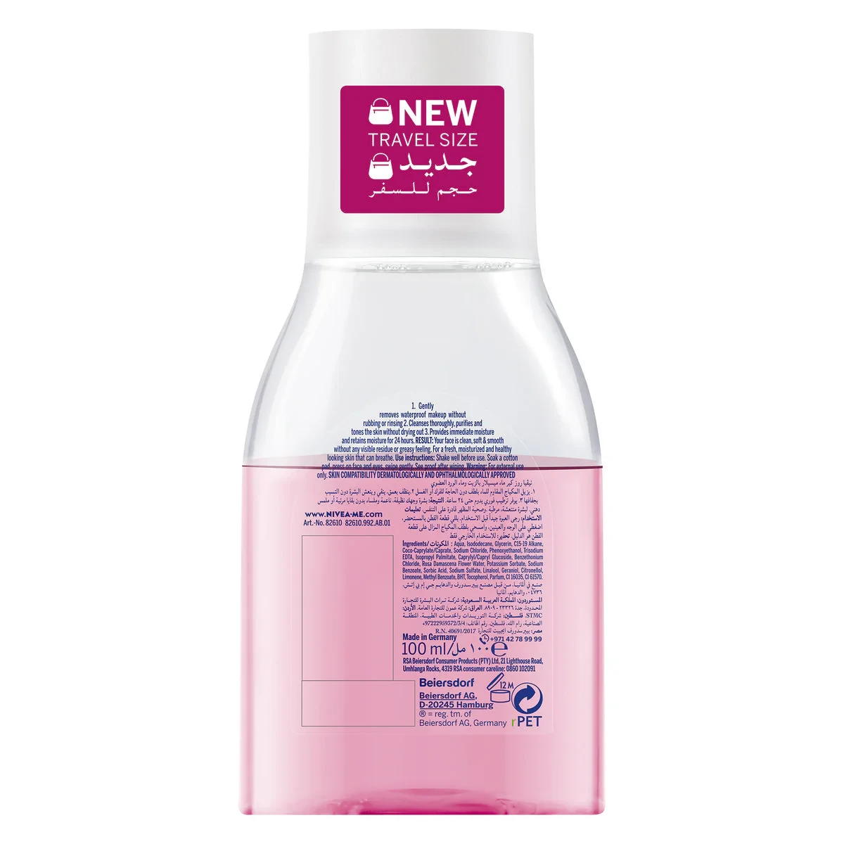 Aqua, Isododecane, Glycerin, C15-19 Alkane, Coco-Caprylate/Caprate, Sodium Chloride, Phenoxyethanol, Trisodium EDTA, Isopropyl Palmitate, Caprylyl/Capryl Glucoside, Benzethonium Chloride, Rosa Damascena Flower Water, Potassium Sorbate, Sodium Benzoate, Sorbic Acid, Sodium Sulfate, Linalool, Geraniol, Citronellol, Limonene, Methyl Benzoate, BHT, Tocopherol, Parfum, CI 16035, CI 61570.Nivea: Trusted skincare brand offering gentle and effective solutions for all skin types.Shake well before use. Soak a cotton pad, press on face, eyes & lips, then swipe gently.For external use only.